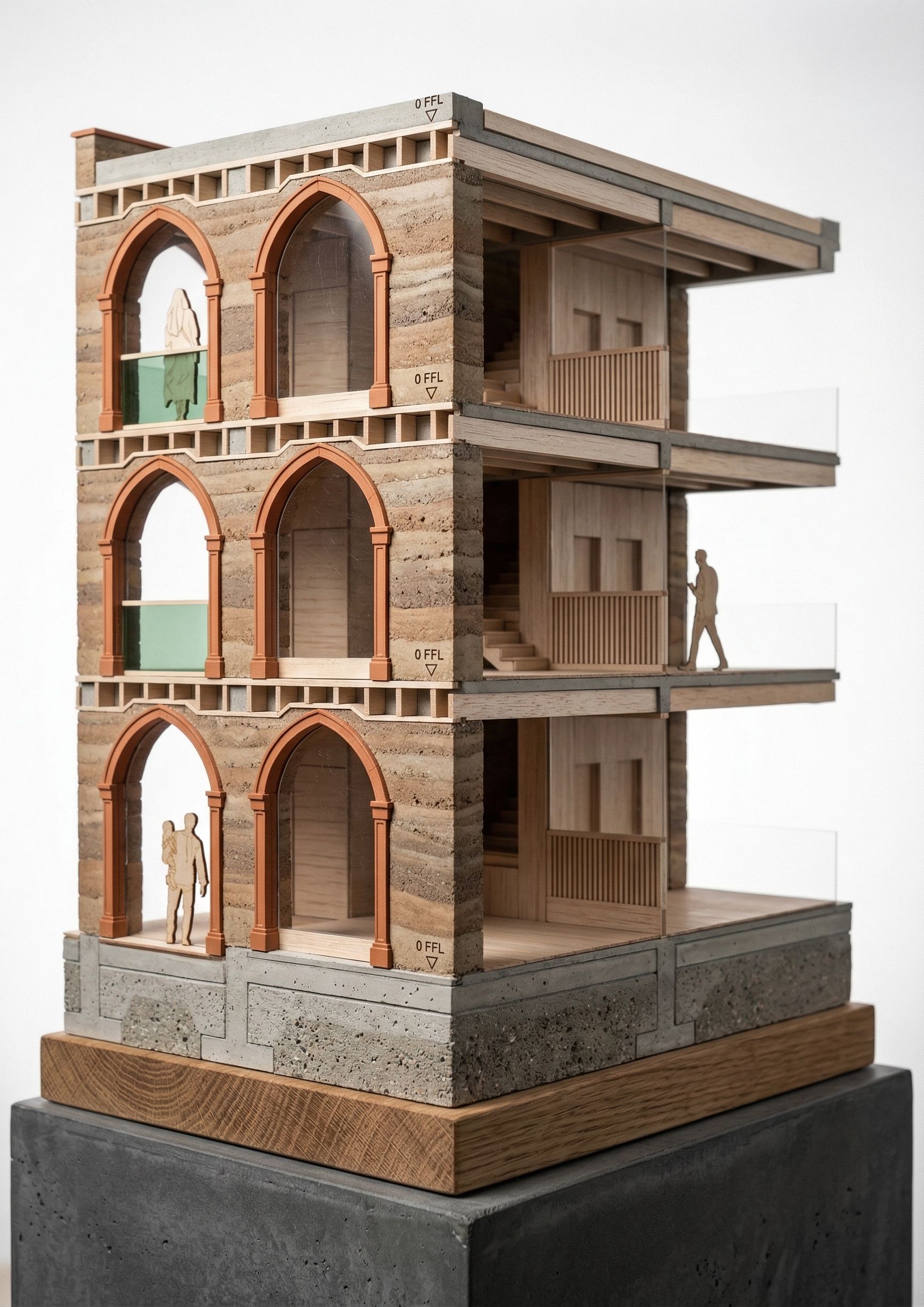 Convert as a realistic hand made architectural model of a building section, made out of rammed earth, balsa wood, concrete. set on a model plinth, in a empty photo studio setting. camera angle set to show model at a 45 degree angle., keep exact camera angle