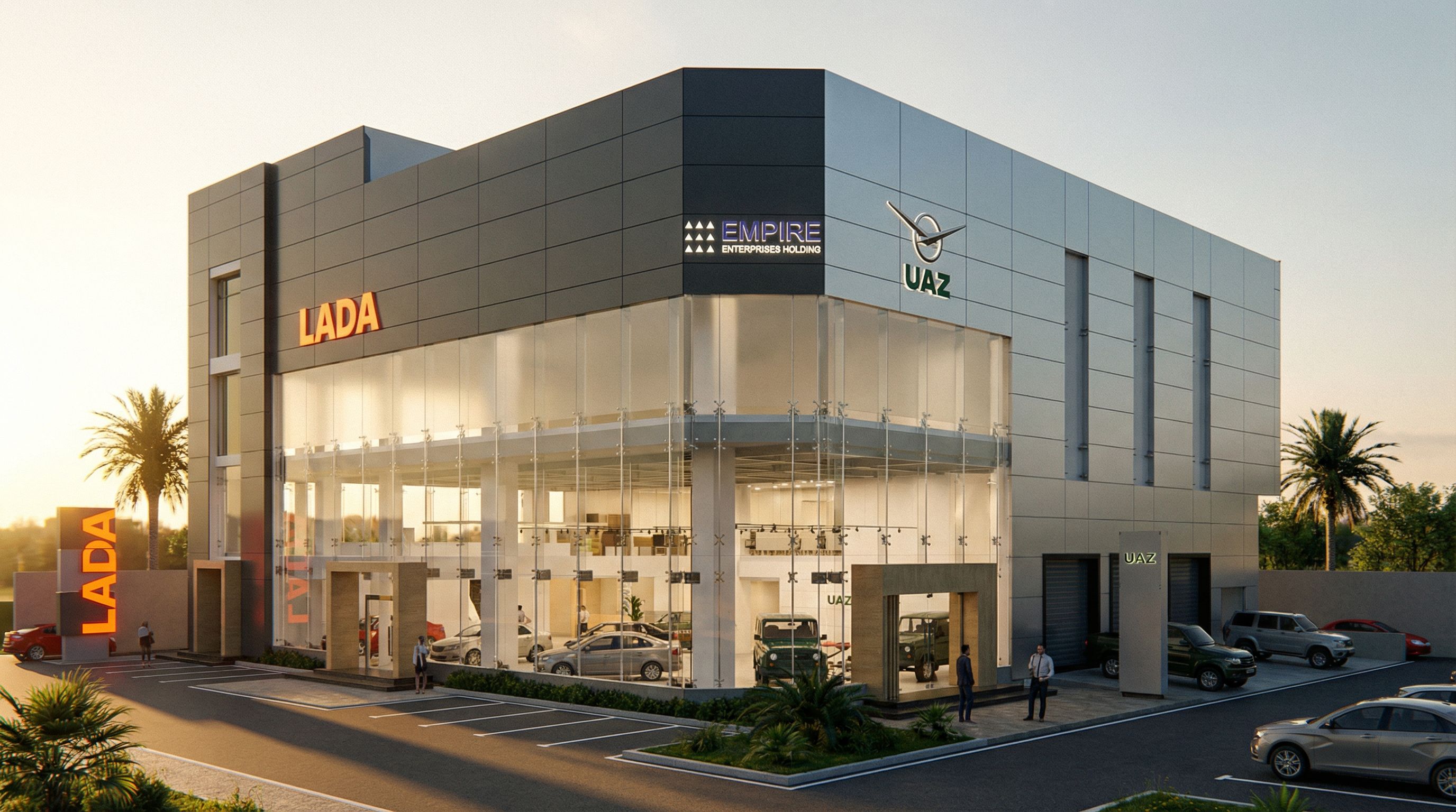 Branding: Illuminated LADA and UAZ logos integrated into the façade, harmonized signage placement maintaining original layout.