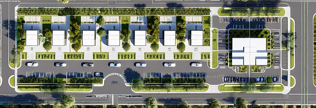 PromptPhoto of a proposed office and factory park with a detailed layout featuring multiple warehousing with attached front office building interconnected by paved driveways and landscaped areas. Emphasize the modern design elements, including the varying heights and volumes of structures, large window facades, and functional spaces. In an urban context, position amidst greenery and sidewalks. Use natural daylight to highlight textures and materials, creating soft shadows. Capture from an aerial perspective with a wide-angle lens to encompass the comprehensive site plan and surroundings effectively. The site includes a service station on one right side with a dinner.