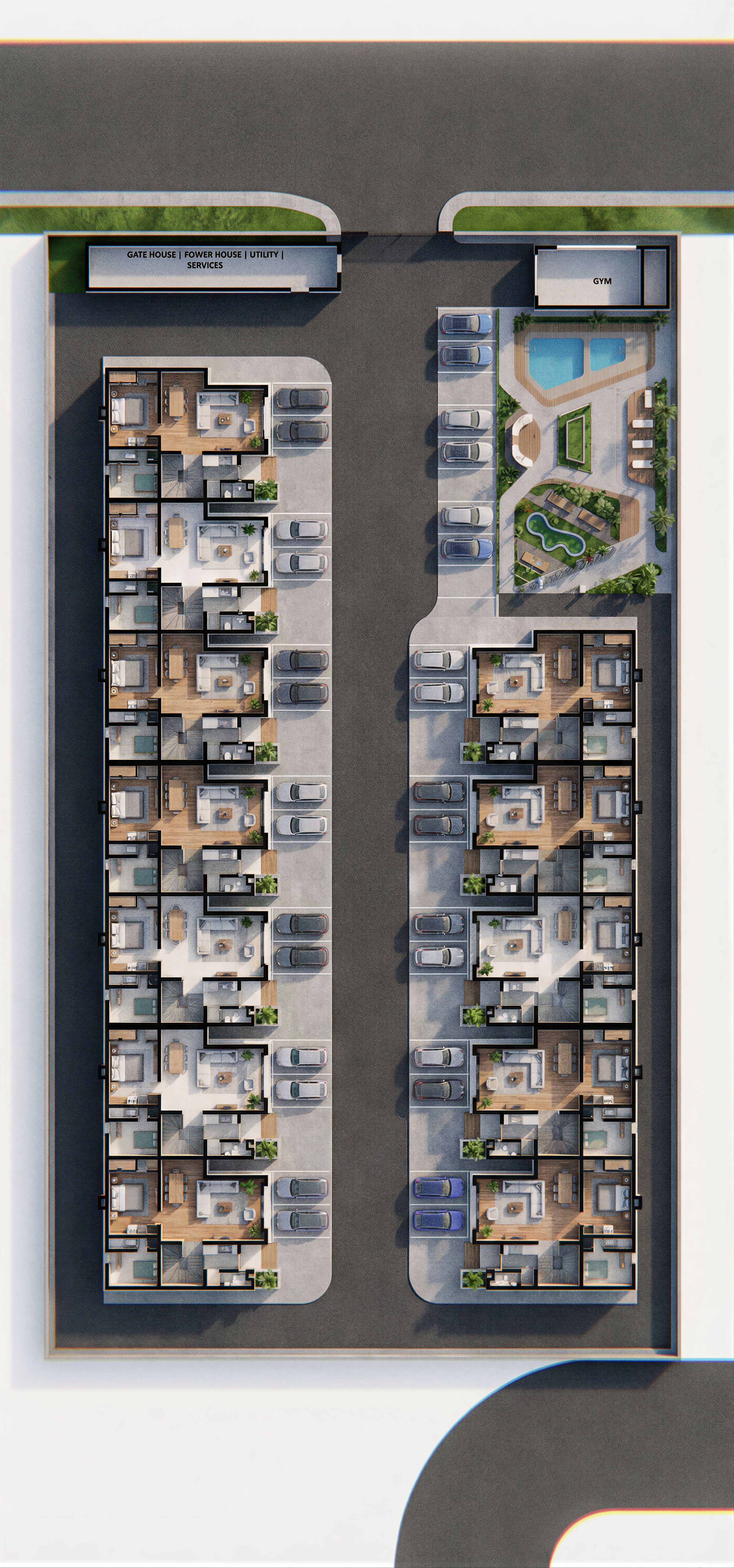 Ultra-realistic floor plan render. Modern apartment layout, clearly defined walls with realistic thickness, black fill color, and clean edges. Natural color palette grey, white, wood tones. Indoor plants, furniture, and subtle decor elements. Soft ambient lighting with global illumination, high-detail textures, realistic materials, professional architectural visualization, photorealistic rendering, sharp focus, clean background, studio-quality, 4K resolution with V-Ray quality raytracing., keep exact camera angle