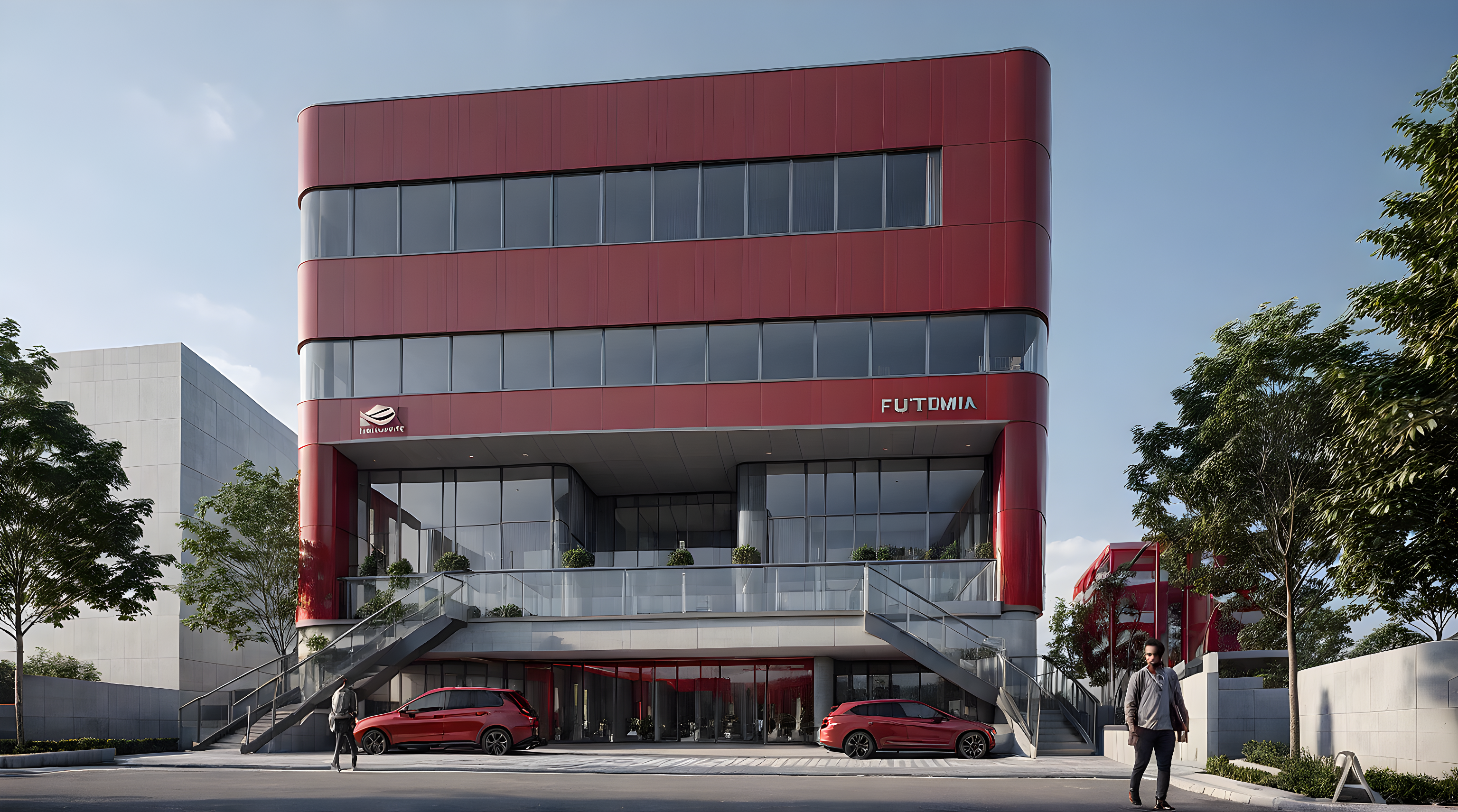 PromptImagine a modern ultra commercial building red and grey colour combination