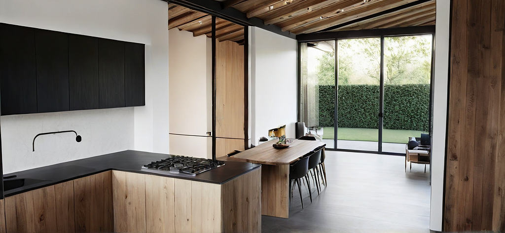 white walls, wood ceiling. black beams, middle wall kitchen chimney, dinner table, glass, modern, simple, sophisticated, windows exterior vegetation