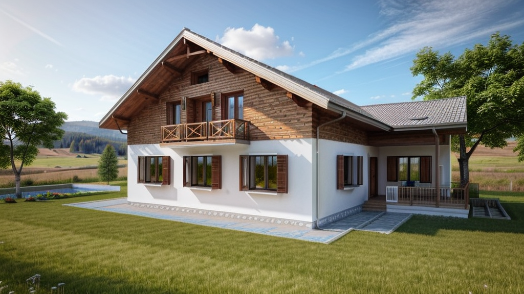 Promptmountain house in Romania, wood on the facade, wood shutters, grass in front of the house, white plaster walls, three identical windows