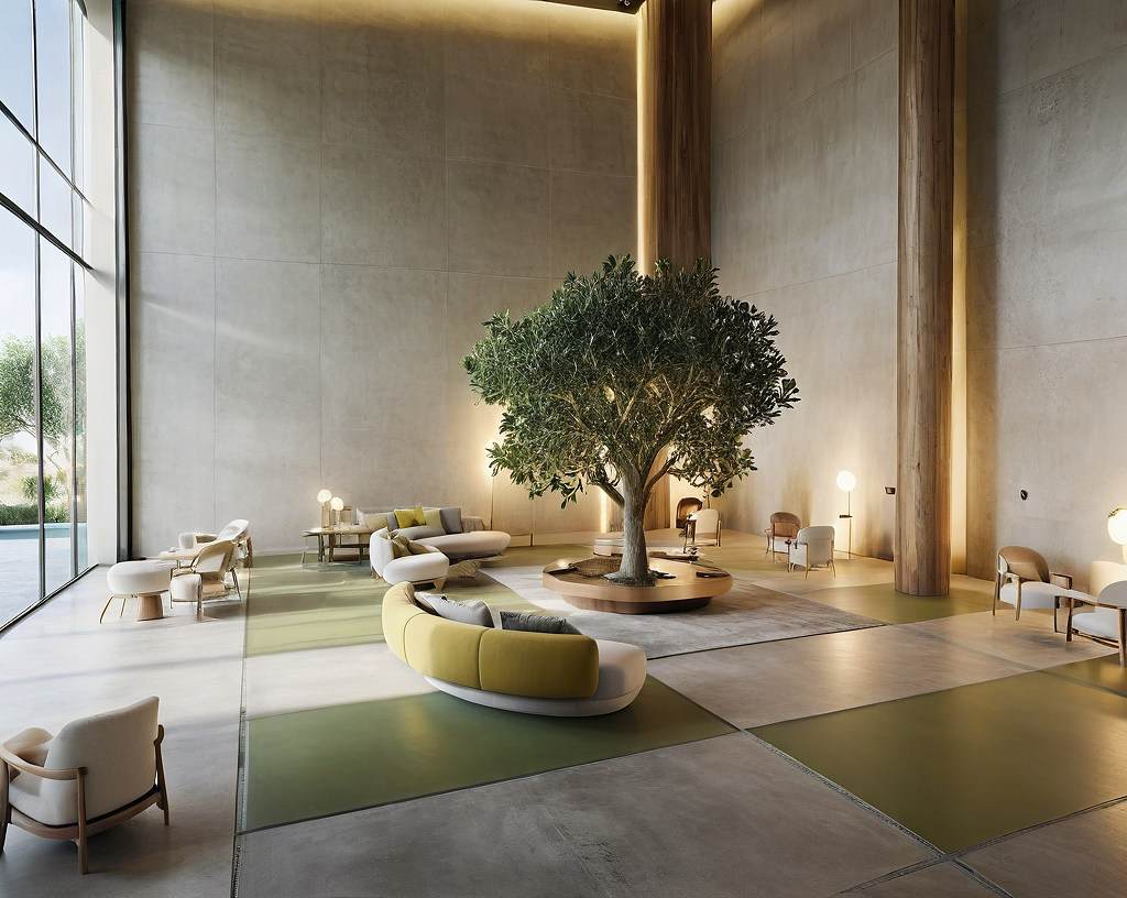Promptmodern vip lounge, olive tree, soft whites (60%), soft greens (30%), soft yellows (10%) color pallette, natural daylight, realistic results, concrete round columns, high quality materials, glass facades, daytime sky mode, enhance wall design