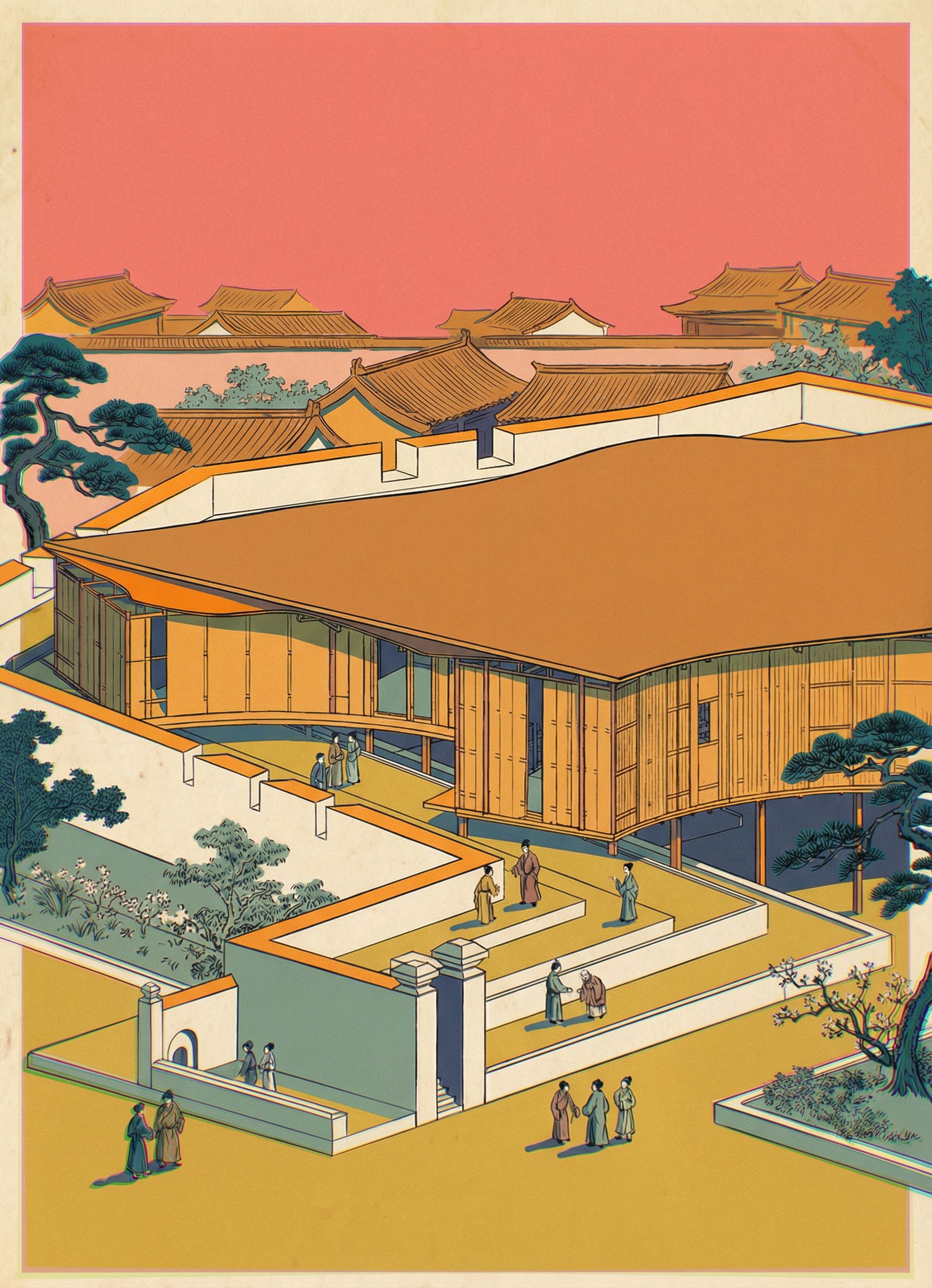 PromptRecolor the architectural illustration using the color palette of mid-20th century Vietnamese propaganda posters. Replace the current muted browns and greens with a bold yet faded poster palette: coral pink skies, mustard yellow ground planes, warm turmeric orange highlights, deep teal vegetation, and dusty sage greens. Maintain the parchment paper background but warm it slightly toward aged cream. The architecture should remain the primary focus with clean, crisp linework. Increase clarity and edge definition across the building, terraces, and stairs. Reduce the watercolor blur currently present in the trees and shrubs; vegetation should appear as flat graphic shapes with defined outlines rather than soft washes. Apply poster-style color blocking: large areas of warm pink sky, golden fields, and teal foliage. Roofs and wooden elements should shift toward warm amber and ochre tones inspired by the posters. Shadows should use muted indigo or desaturated teal rather than gray. Keep the drawing style slightly illustrated and graphic rather than photorealistic. Preserve the hand-drawn ink lines, parchment texture, and architectural detail, but increase overall clarity and contrast so the scene reads cleanly and sharply., keep exact camera angle
