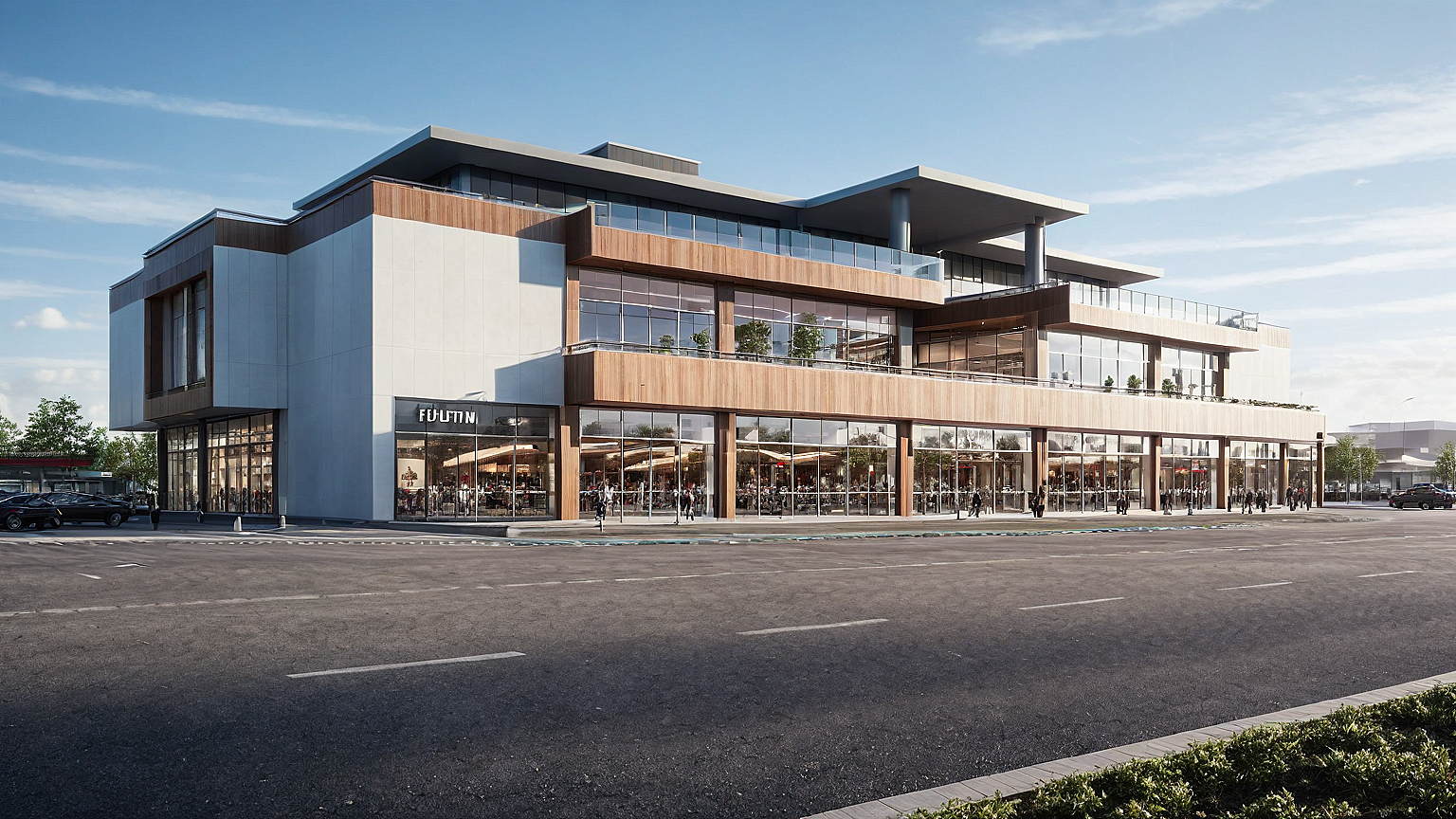 Promptshopping mall, cars, trees, people, realistic rendering, modern facade, realistic sky, parked cars, lighting on the facade, small trees in front of the building, people walking, cars passing by