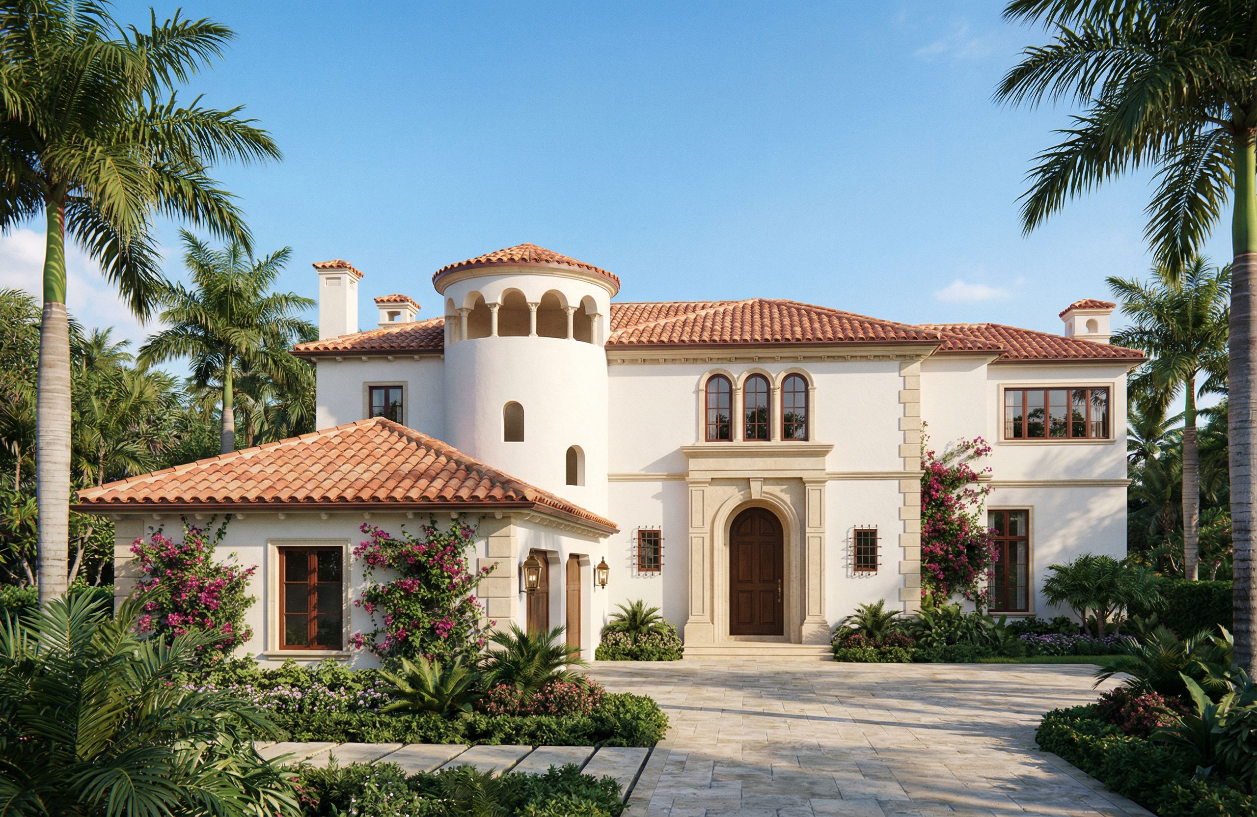 Use the first image architectural elevation drawing as the exact geometry and massing blueprint. Render this elevation as a photorealistic Mediterranean / Palm Beach style house. Geometry Rules MANDATORY The elevation drawing controls 100% of the architecture Match all massing, roof shapes, window placement, door placement, and proportions exactly Do not change the silhouette Do not redesign architectural elements Convert the 2D elevation into a photorealistic 3D view while preserving the exact design Architectural Massing from the elevation Central two-story entry mass with large arched doorway Triple arched window above the entry Cylindrical tower on the left with open arcaded belvedere cylindrical tower on the right Front projecting garage volume with hip roof Mediterranean clay tile roofs Materials inspired by reference image Use the second image only for material palette and landscape style, NOT architecture. Materials: smooth white Mediterranean stucco terracotta barrel clay roof tiles light limestone trim and surrounds dark wood entry door bronze lantern lighting Landscape + Context from reference tropical South Florida landscaping palm trees bougainvillea Mediterranean courtyard garden natural stone paving lush planting Lighting warm 3 PM Florida sunlight soft natural shadows bright blue sky photorealistic lighting Camera slight perspective from the front eye level architectural photography 28–35mm lens Rendering Style ultra photorealistic architectural visualization luxury Palm Beach estate realistic materials and vegetation Negative Constraints Do not use the reference image for architectural design Do not copy the reference building Do not change massing from the elevation Do not move windows or doors Do not alter roof forms The elevation drawing must remain the exact building design, keep exact camera angle
