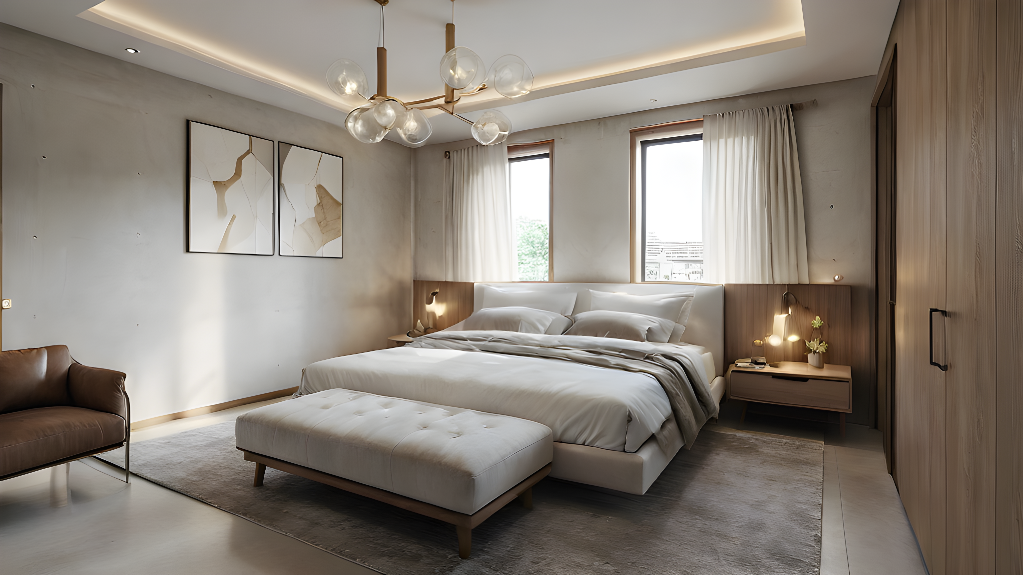 Promptmodern bedroom, white curtain, light brown window and door frame, white smooth concrete walls