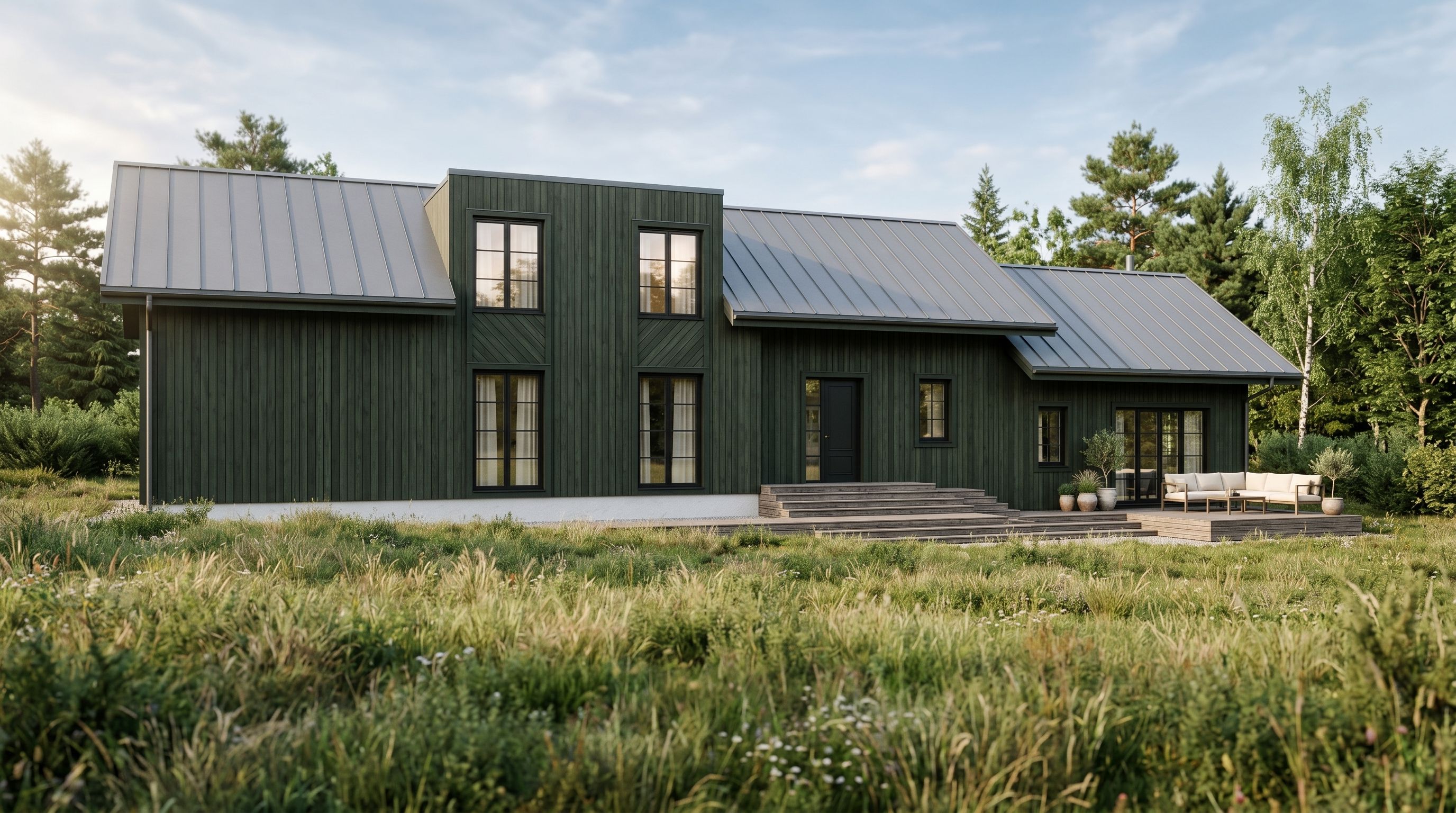 Promptplease render this house. Exterior is dark green wood facade and grey metal roof. house is new. add some curtains at the windows. add lounge furniture on terrace. environment is meadow like grass with some greenery. Entrance steps and terrace are wooden. , keep exact camera angle