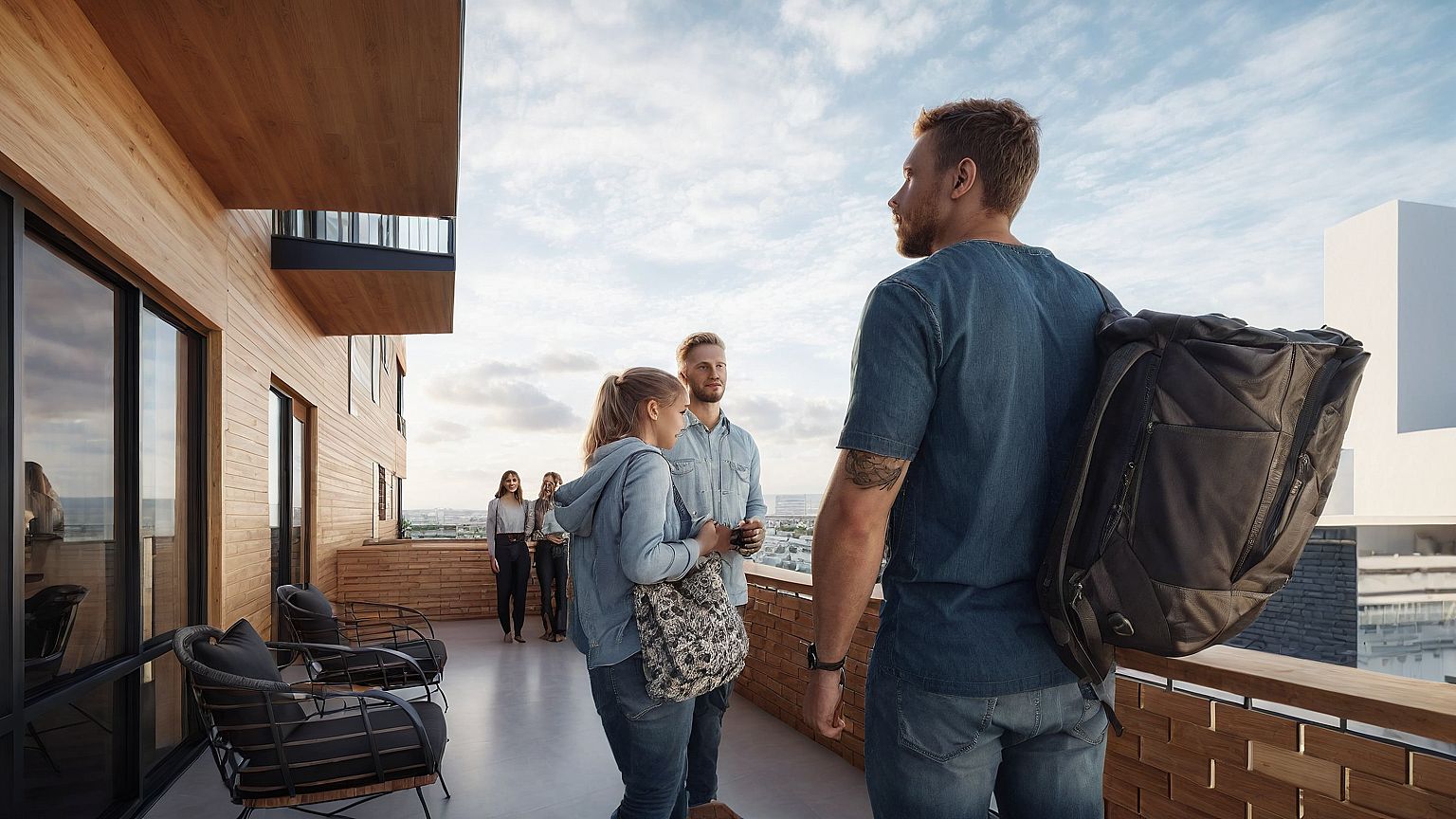 PromptBalcony apartment featuring an urban view through the window, modern design with mass timber bulding style