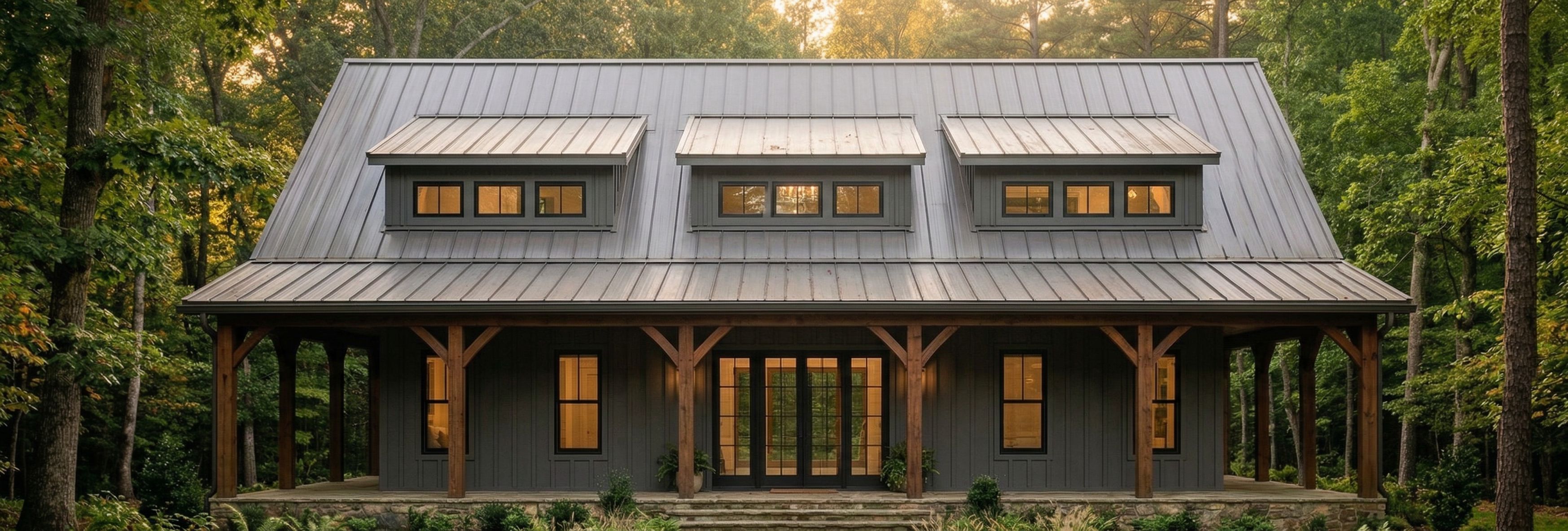 PromptA photorealistic 3D architectural visualization of a modern farmhouse barndominium. The exterior features dark grey board-and-batten siding with dark natural timber-frame columns and braces. Large symmetrical black-framed windows and a central set of glass French doors. A high-pitched gabled roof with metal roofing. Set in a lush green forest during the golden hour with soft, warm sunlight and realistic shadows. 8k resolution, cinematic lighting, highly detailed textures., keep exact camera angle