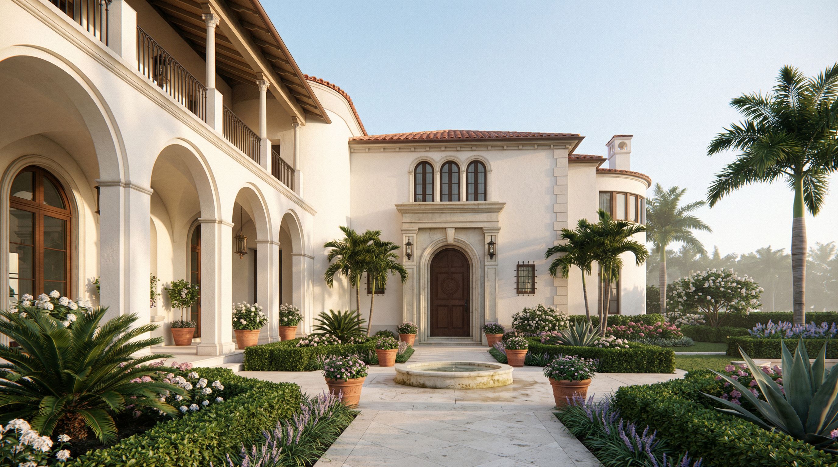 Maintain the same architecture, proportions, openings, and overall layout. Enhance the scene into a refined, romantic Mediterranean courtyard garden for a private Palm Beach residence.