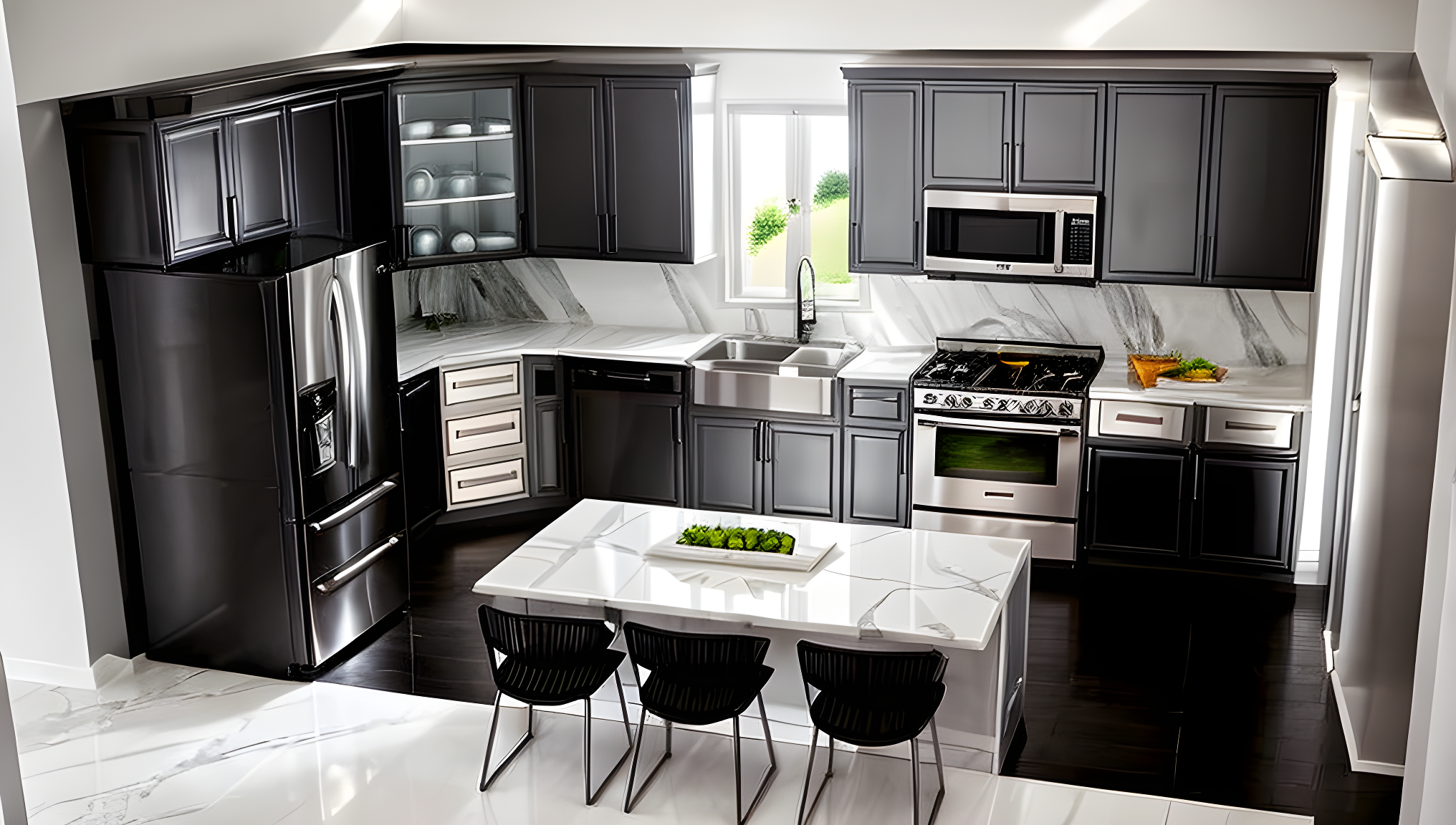 PromptI’d like the same details as in this design, with white cabinets and stainless steel appliances including the microwave, oven, refrigerator, and dishwasher. I prefer marble countertops over the lower cabinets instead of ceramic, and the same marble for the island. Change the chairs to gray instead of black, and add LED lighting under the island.