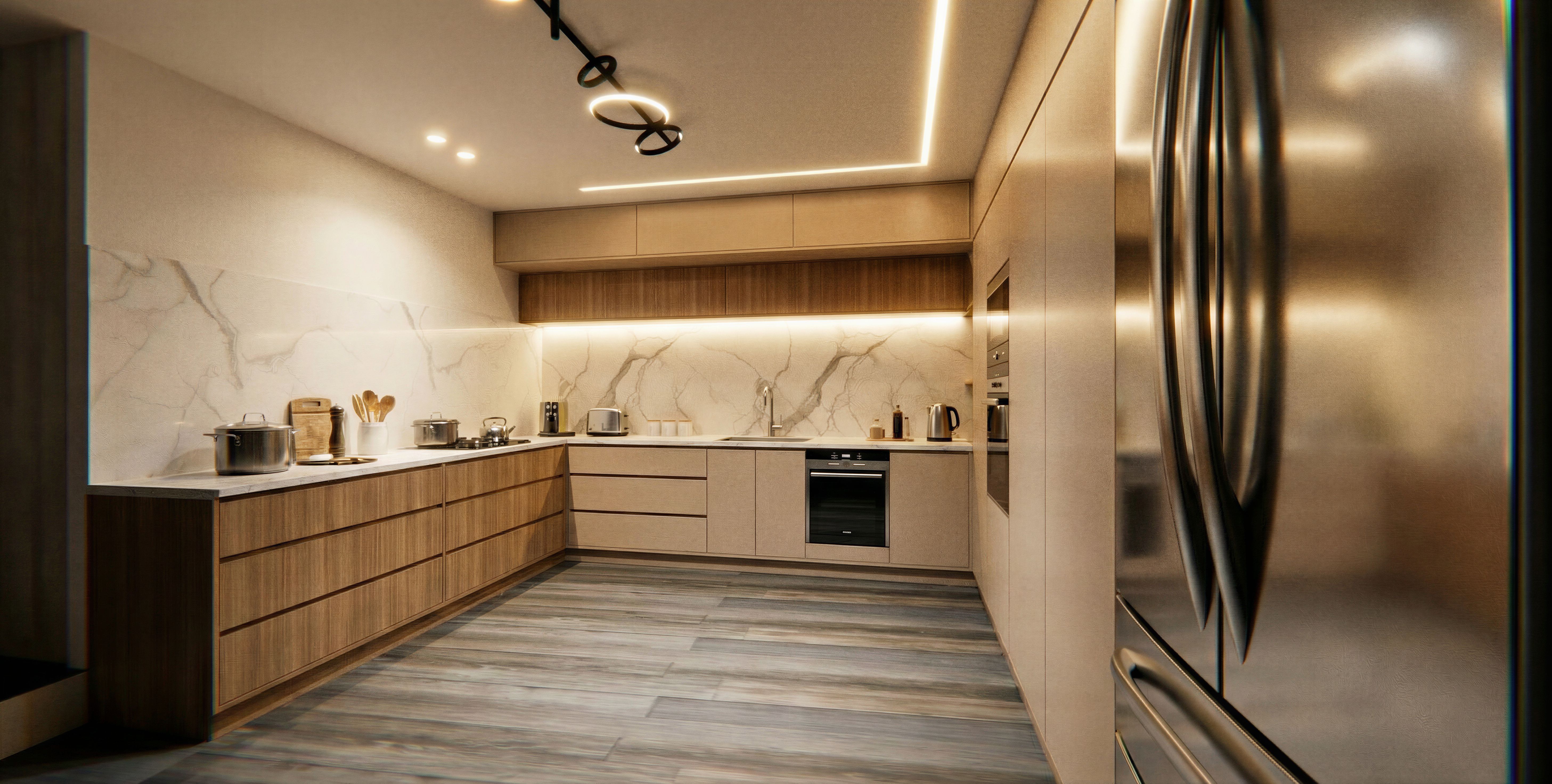 The floor is parket gray wood color Photo of a modern kitchen interior, featuring sleek cabinetry in light wood tones and a striking marble backsplash. The design showcases high-end appliances, including a stainless steel refrigerator and built-in oven. Warm, ambient lighting softly illuminates the space, enhancing the textures of the materials. The camera angle captures an inviting view, emphasizing the layout and functionality of the kitchen. Shadows from the overhead lighting create a dynamic contrast on the surfaces. floor is gray wood parket Do not change the structure Do not change the location of the cabinets The floor is parket gray wood color Add lighting to the ceiling