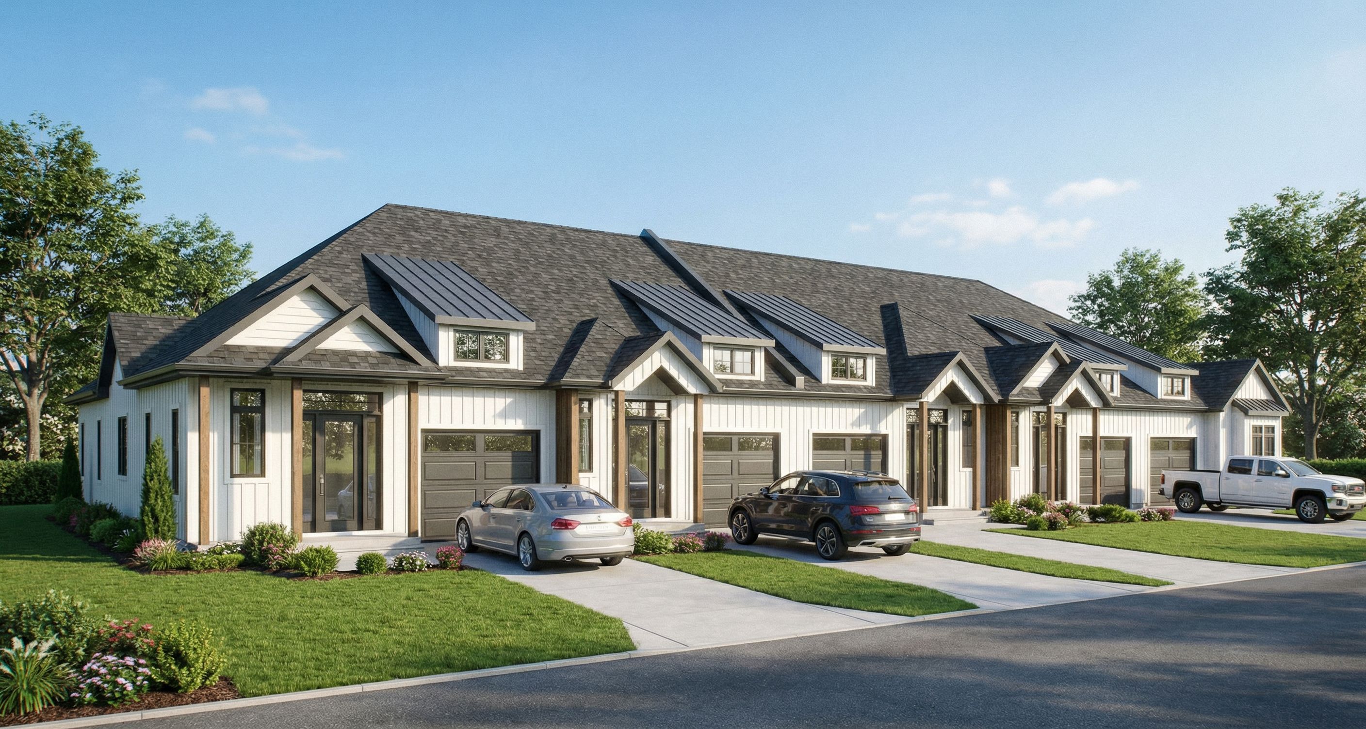 Photo of a modern townhouse complex featuring multiple attached units, showcasing a combination of white siding and dark shingles. Emphasize the intricate design of gabled roofs, large front windows, and attractive porches. The setting includes manicured lawns and a well-paved driveway leading into the garages. Bright, natural daylight illuminates the facade, creating soft shadows that enhance architectural details. Captured from a low angle using a wide-angle lens, the framing highlights the symmetry and spaciousness of the design, with a clear blue sky in the background., keep exact camera angle
