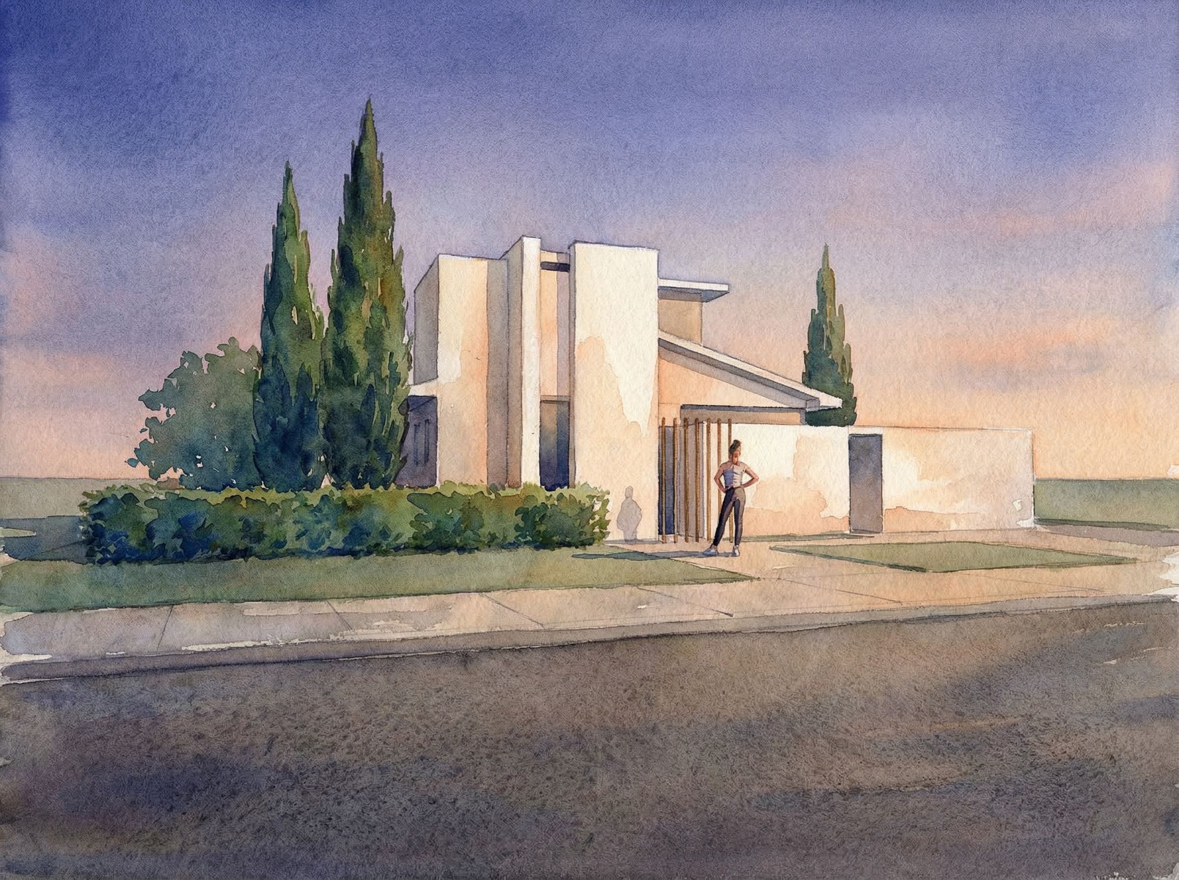 architectural sketch, render this sketch into watercolor painting, contemporary, keep exact camera angle, dusk atmosphere with soft lighting, including shading and shadows, textured surfaces, depth and perspective, high quality, professional, detailed scene