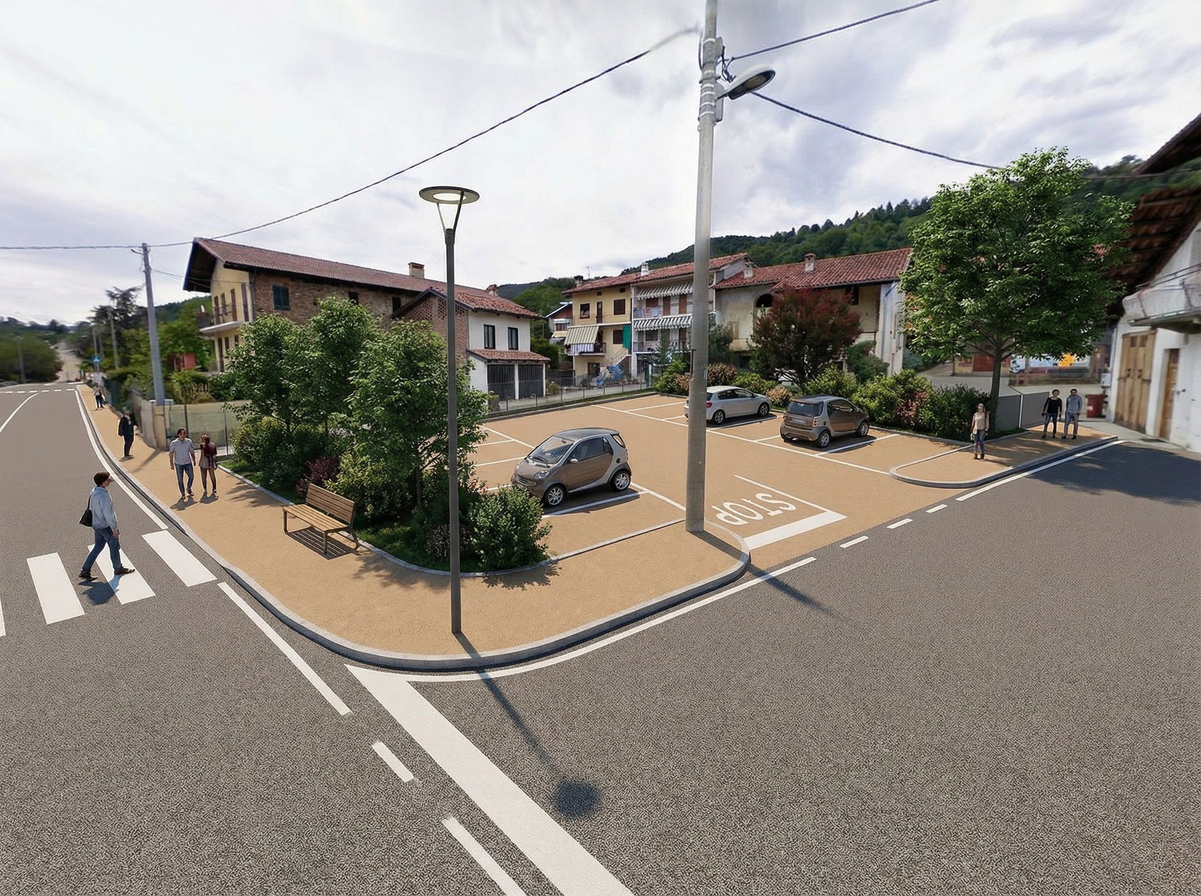 architectural exterior rendering, render this wireframe into photorealistic rendering, render fotorealistico del progetto fatto con schizzo a mano di un nuovo parcheggio localizzato in un terreno adesso a prato a Vidracco tra la strada provinciale e la strada comunale via commendatore Ceratto. Il render è da inserire nell'immagine di riferimento. Il nuovo parcheggio prevede una pavimentazione tipo terra solida colore marrone chiaro con marciapiede della stessa tipologia , I parcheggi delle auto sono delimitati da striscie bianche e sono posizionati come da schizzo in due settori paralleli con una corsia intermedia di 6 metri dove c'è scritto stop sulla pavimentazione . Il marciapiede conduce ad un attraversamento pedonale solo sulla strada provinciale . E' previsto un nuovo palo della luce altezza 4 metri modello BEGA 88164 con corpo illuminante tipo disco . E' prevista un aiuola filtro tra il parcheggio e il marciapiede . L'aiuola è fatta con cespugli autoctoni e piante alte 4 m che portano ombra sul parcheggio. Vicino all'aiuola c'è una panchina in legno modello MMcitè LWD 110. Nel render inserire due auto posteggiate di uguale dimensione, alcuni pedoni sul marciapiede ed uno che attraversa sulle striscie pedonali. ealizza render fotorealistico del progetto fatto con schizzo a mano di un nuovo parcheggio localizzato in un terreno adesso a prato a Vidracco tra la strada provinciale e la strada comunale via commendatore Ceratto. Il render è da inserire nell'immagine di riferimento. Il nuovo parcheggio prevede una pavimentazione tipo terra solida colore marrone chiaro con marciapiede della stessa tipologia , I parcheggi delle auto sono delimitati da striscie bianche e sono posizionati come da schizzo in due settori paralleli con una corsia intermedia di 6 metri dove c'è scritto stop sulla pavimentazione . Il marciapiede conduce ad un attraversamento pedonale solo sulla strada provinciale . E' previsto un nuovo palo della luce altezza 4 metri modello BEGA 88164 con corpo illuminante tipo disco . E' prevista un aiuola filtro di fronte alle striscie pedonali tra il parcheggio e il marciapiede . L'aiuola è fatta con cespugli autoctoni e piante alte 4 m che portano ombra sul parcheggio. Vicino all'aiuola c'è una panchina in legno modello MMcitè LWD 110. Nel render inserire due auto posteggiate di uguale dimensione, alcuni pedoni sul marciapiede ed uno che attraversa sulle striscie pedonali. , eye level view, bright daylight, natural lighting, including people, vehicles, greenery and vegetation, trees, street furniture, high quality, professional, detailed scene