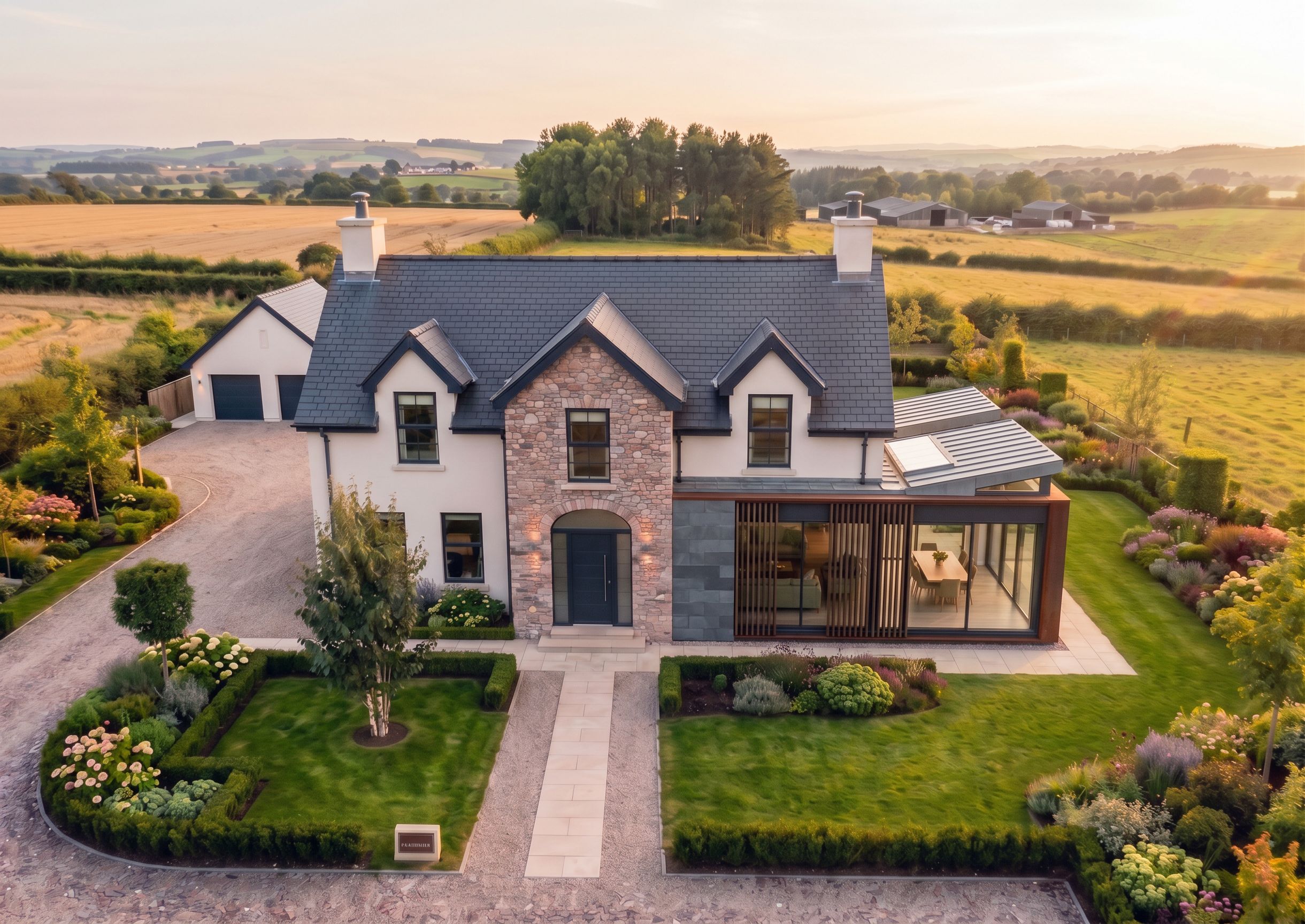 Promptcan you give me another concept of a modern extension on to the right side of the primary structure of the house. Use different materials but keep the main structure of the house the same with the stone work in the middle.