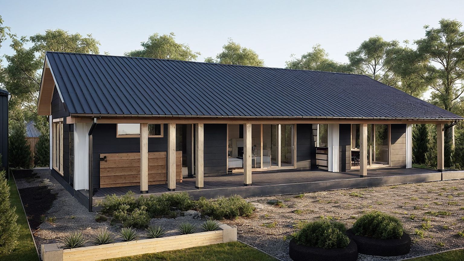 Design a high-end, Scandinavian-style wooden house by Honka. One-story layout, rectangular shape with two distinct wings bedroom and service. Large covered terrace runs along the entire front façade. Exterior features dark grey horizontal wooden cladding, white vertical support beams, and a matte black gable metal roof. Full-height glass sliding doors open from the living and dining area to the terrace. Inside: spacious open-plan living room with dining and lounge zones, three compact bedrooms in one wing, and kitchen + bathrooms in the other. garden with evergreen trees. Natural light and premium log construction are key. The house is symmetrical and grounded, in light colours.