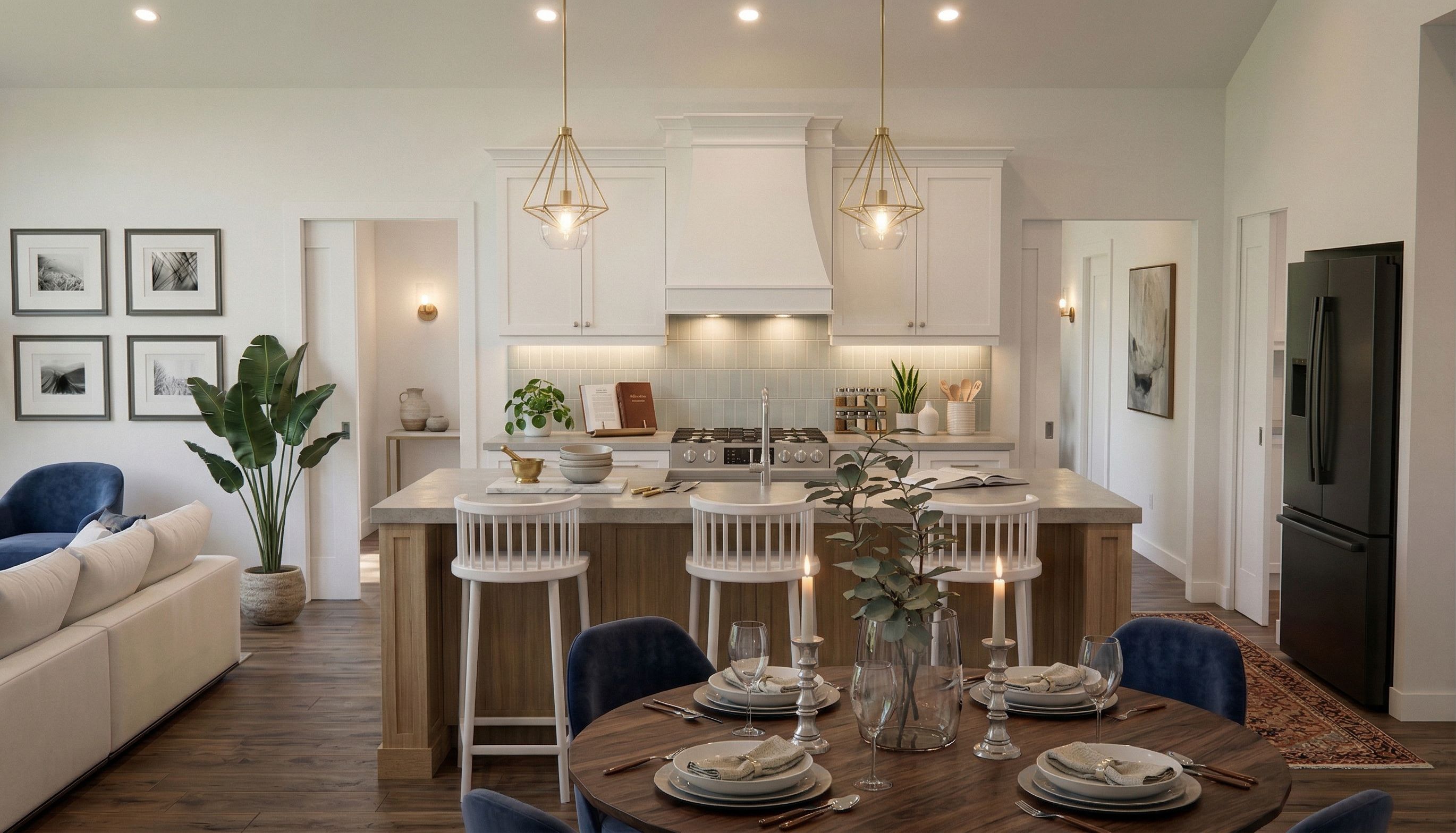 Promptshow half open white pocket doors with hall ways behind on each side of kitchen, keep exact camera angle