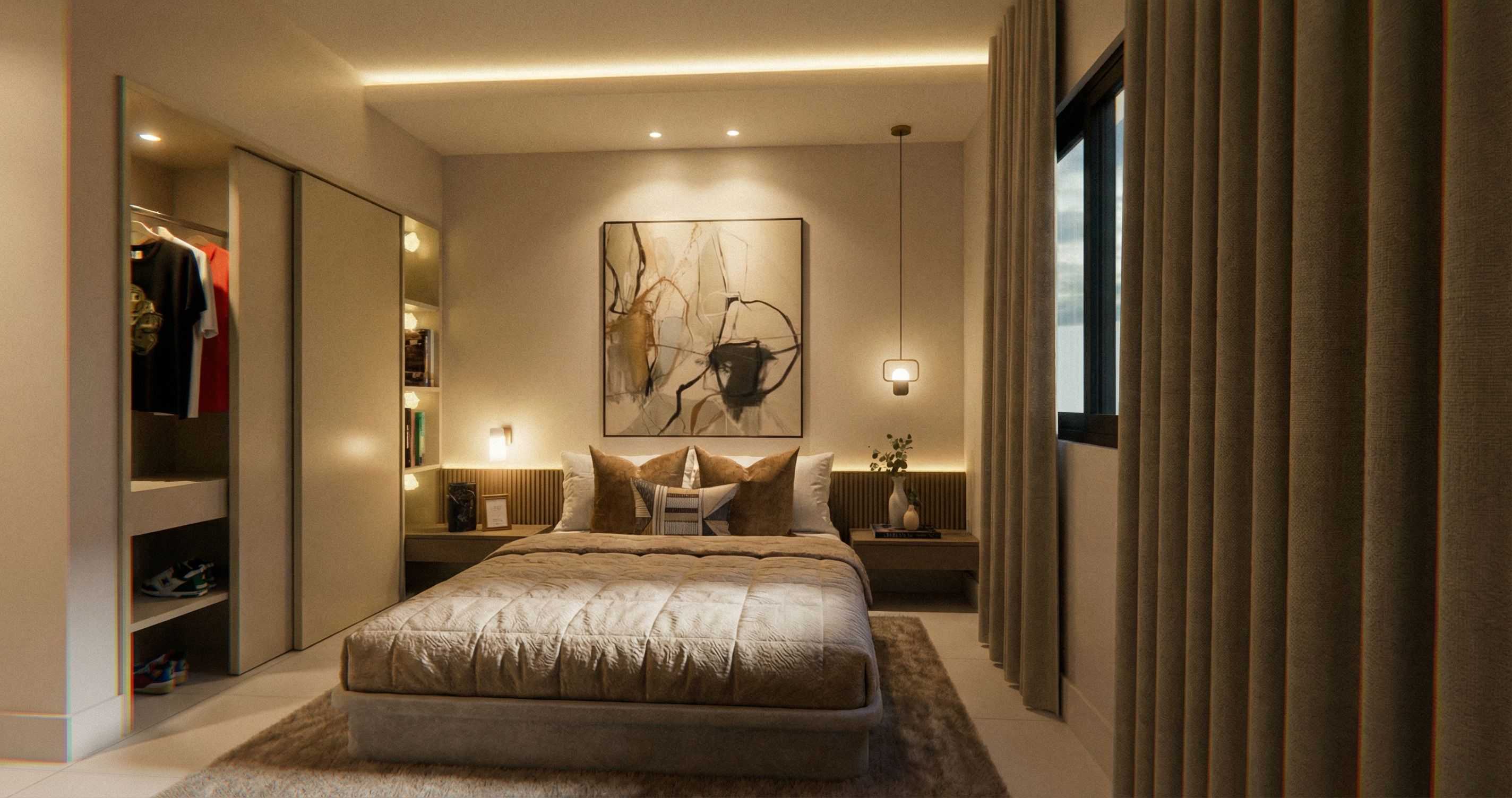 Promptthe walls color is pearl white. add atmosphere clarity light to all spaces. the ceramic tile is matte white color. the floor skirting boards are matte white color, like the tiles. well-smoothed ceiling. well-smoothed walls. ceiling lights on. wall light on. atmosphere dusk darkening, keep exact camera angle