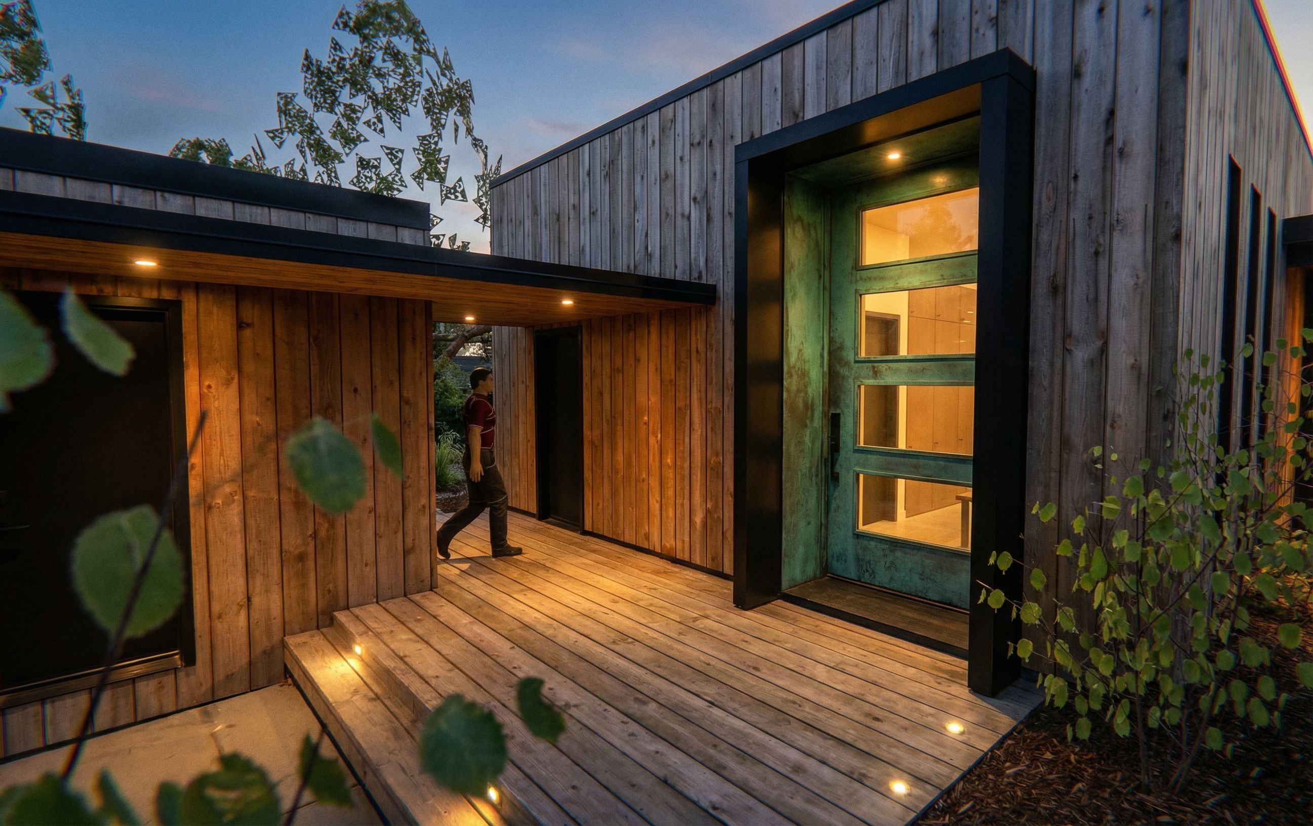 green copper door with black frame. only the door in green copper.. Entrance with led spot lights integrated in the floor on both sides. Spot lights inside top of door frame. Lights leading towards entrance.