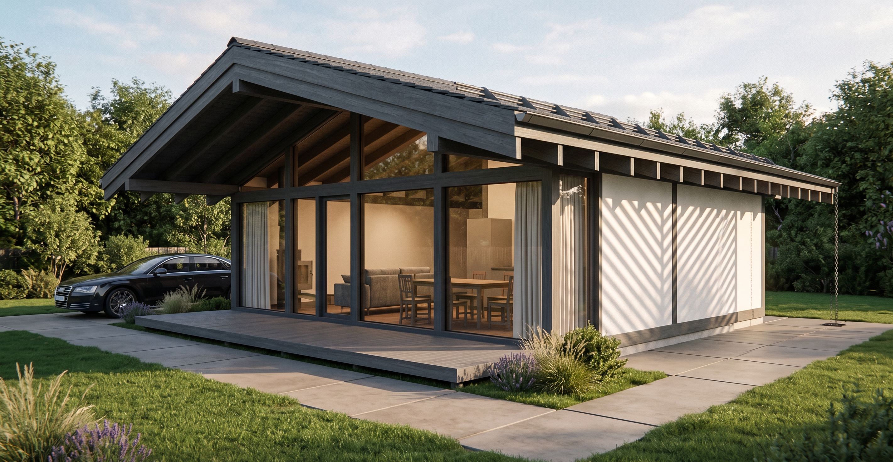 Современный одноэтажный загородный дом в стиле минимализм с элементами скандинавской и японской архитектуры, расположен на просторном участке, окружённом густыми лиственными деревьями. Дом с двускатной крышей, широкими свесами и деревянными балками и террасой в цвете серый графит. Убери сваи террасы чтобы их не было видно. Фасад сочетает панорамное остекление от пола до потолка и светлые панели, создавая контраст между прозрачностью и закрытыми поверхностями. Передняя часть дома полностью стеклянная, через неё видно уютный интерьер: мягкий диван, лёгкие занавески, приглушённое освещение. Внутри ощущение спокойствия и простоты. Рядом с домом организована современная парковочная зона и подъезд из крупноформатной архитектурной плитки или бетонных плит large format concrete slabs, аккуратно уложенных с тонкими швами, в нейтральных серо-бежевых тонах. На этом покрытии припаркован современный седан тёмного цвета. Участок покрыт аккуратно подстриженной травой с лёгкой естественной небрежностью, присутствуют небольшие кусты и растения на переднем плане. Переход между газоном и плиткой выполнен аккуратно, с минималистичным ландшафтным дизайном. Дом окружён высоким забором и плотной зеленью, создающей ощущение уединённости. Освещение — мягкий тёплый дневной свет, вероятно утро или ранний вечер, длинные мягкие тени, реалистичная глобальная иллюминация. Небо светло-голубое с редкими облаками. Атмосфера — спокойствие, приватность, гармония с природой, современная эстетика slow living. Стиль: фотореализм, архитектурная визуализация, ultra-detailed, 8k, soft natural lighting, global illumination, ray tracing, realistic shadows, depth of field, keep exact camera angle