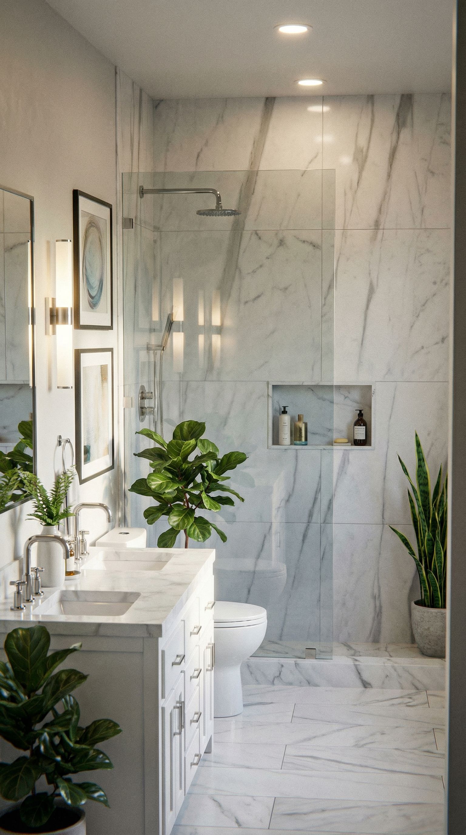 PromptPhoto of a contemporary bathroom featuring sleek design elements such as a double vanity with modern faucets and a minimalist toilet enhancing the space's luxury. The frameless glass shower door presents a seamless transition, reflecting light beautifully. Ambient natural light filters through the translucent shower panel, creating soft shadows and highlights. Captured from a corner perspective, the framing emphasizes the spaciousness, with a wide-angle lens enhancing the overall immersiveness of the scene. add a shower curb, tile walls and tile floor, keep exact camera angle