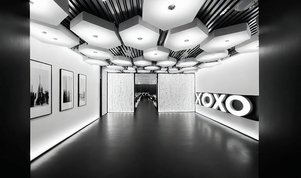 modern architecture, gallery, event space, modern chairs, linear lights, focused lighting, black and white ceilings, photorealistic