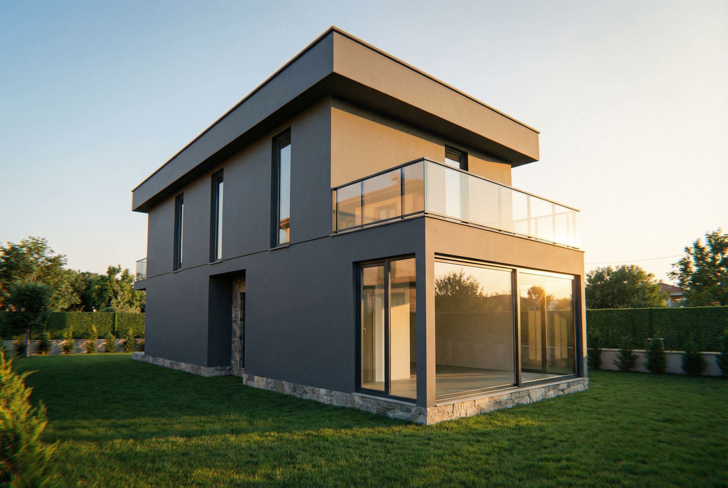 PromptPhoto of a modern residential building featuring sleek geometric shapes and expansive glass windows. Emphasize the smooth composite façade, contrasting the sharp dark grey window frames and railings. Set in a minimalist garden with manicured grass, surrounded by a serene urban landscape. Natural daylight casts soft shadows, highlighting the architectural details. Capture from a low-angle perspective, showcasing the height of the structure, with a wide-angle lens to emphasize the spacious layout and surrounding environment., keep exact camera angle