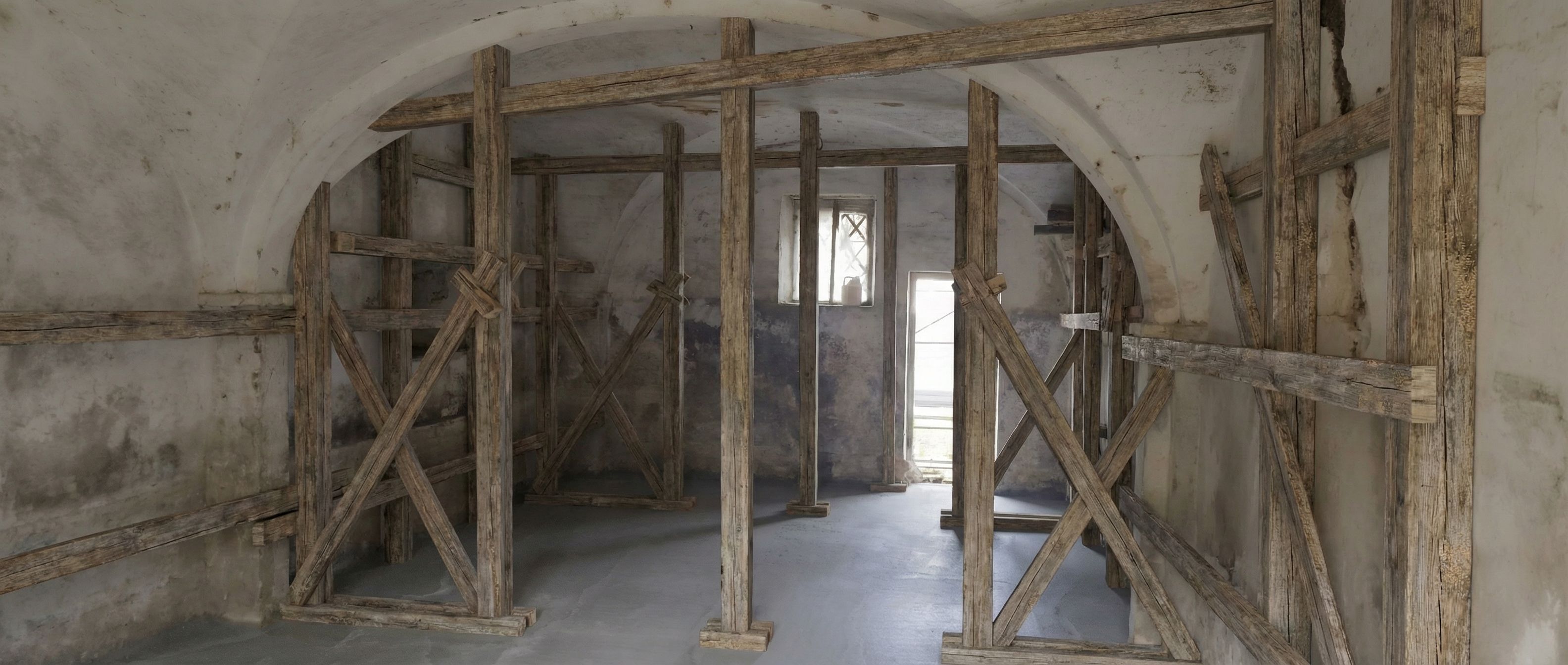 Promptarchitectural exterior rendering, render this 3D mass into photorealistic rendering, ADD A SUPPORTING SYSTEM TO THE FLOOR WITH TIMBER PROPS, MADE UP OF UPRIGHTS, BOARDS, BANDS, CAT JOINTS AND CROSSES; THERE ARE ONE TIMBER PROPS EACH ONE SQUARE METER. THE CEILING IS 40 SQUARE METERS., keep exact camera angle, high quality, professional, detailed scene