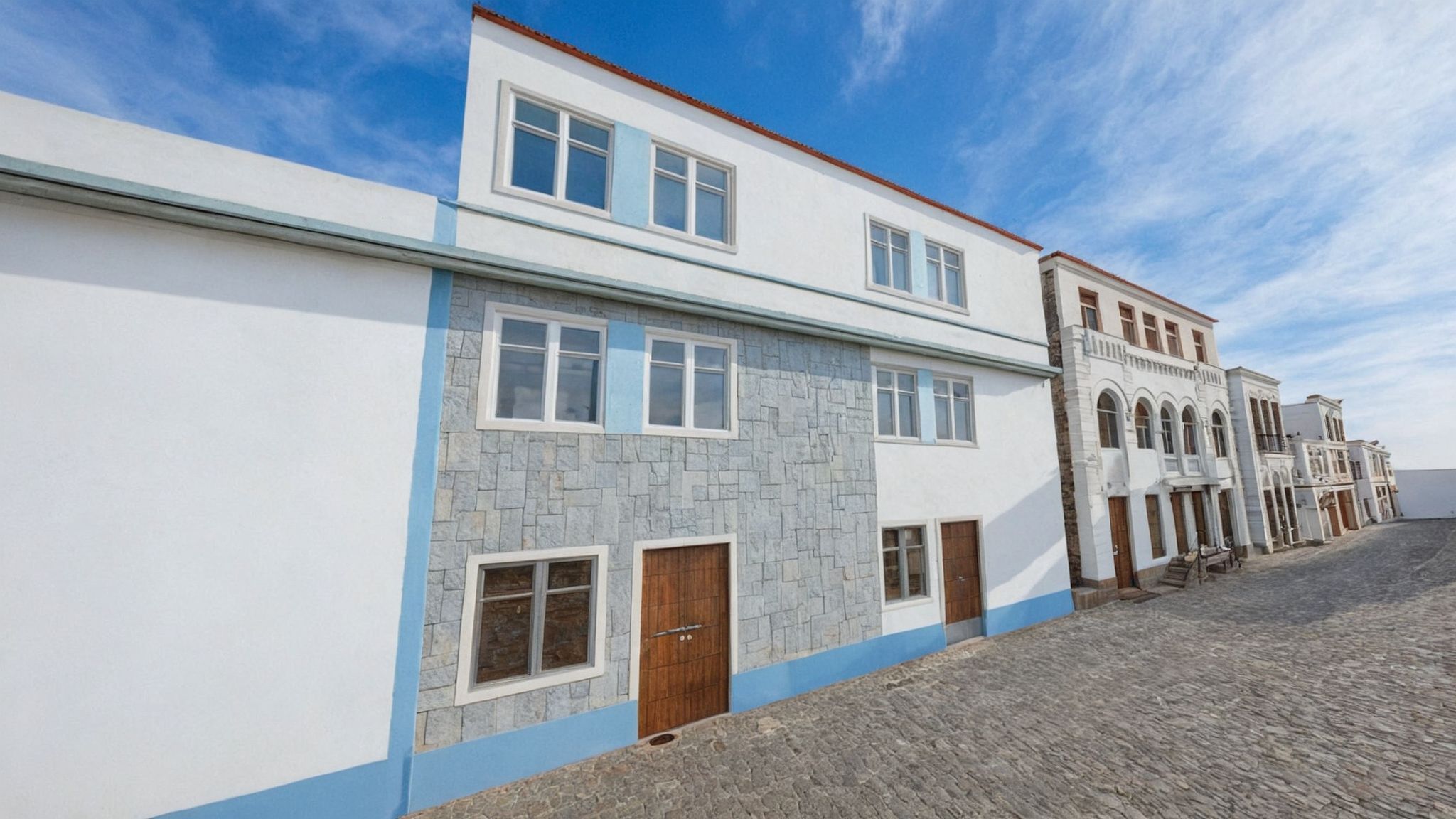PromptPhoto of a modern residential building with a combination of stone and plaster exterior. The design features large windows framed in wood, providing a warm contrast to the stone facade. Set in an urban environment with a cobblestone street and historic buildings nearby. Captured in soft afternoon light, emphasizing textures and shadows. Perspective taken from a low angle to accentuate the height and detail of the structure, with a wide-angle lens to capture the surrounding architecture.