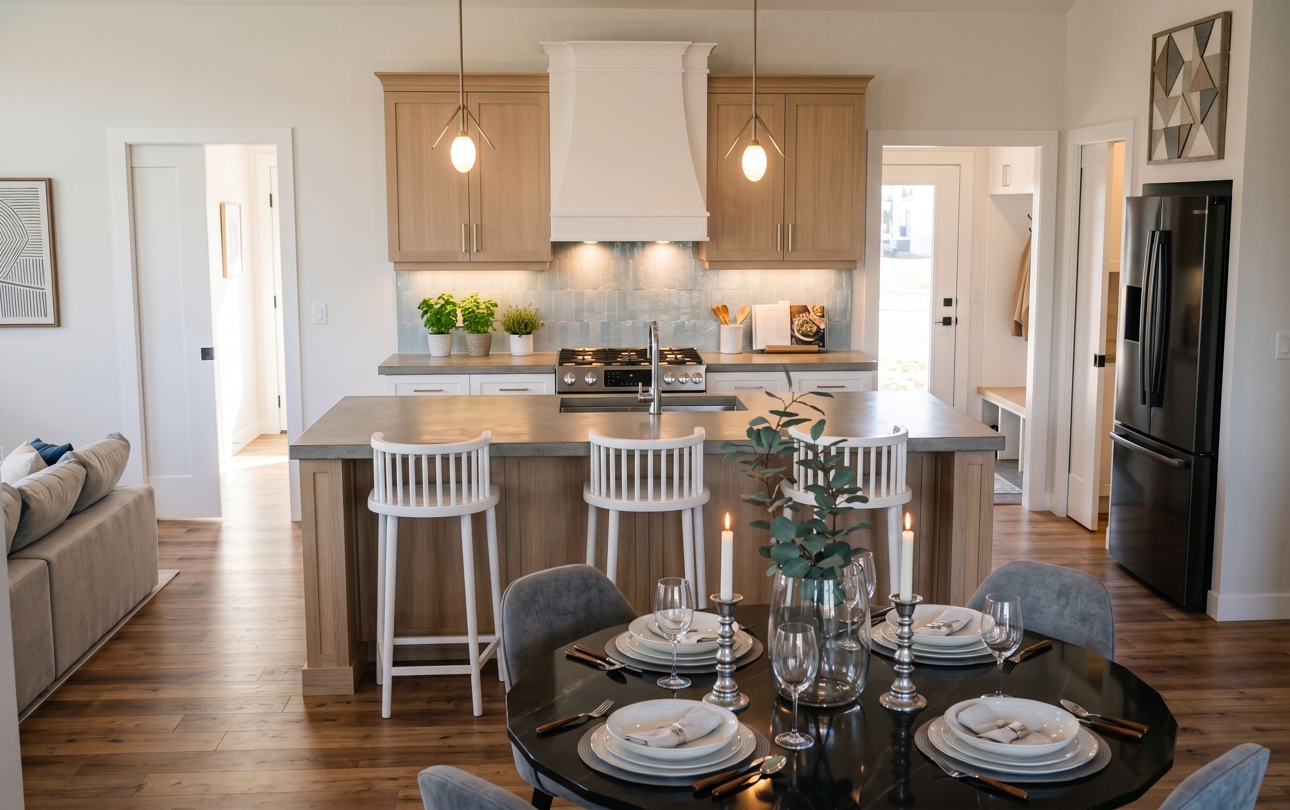 PromptPhoto of a modern kitchen interior showcasing a spacious open layout. Highlight the sleek cabinetry with a mix of matte and glossy finishes, the textured blue backsplash, and polished countertops. Emphasize the contemporary dining area adorned with elegant table settings, including fine china and glassware. Urban setting integrated with natural wood flooring and subtle plant accents. Soft, ambient lighting from overhead fixtures creates inviting shadows, contrasting with warm tones. Camera angle captures a dynamic perspective, focusing on the kitchen island's details and the dining atmosphere for an immersive experience. white pocket door to hallway on the left and white pocket door to mudroom on the right, have all lights turned on, under valance lights, stove lights, white range hood cover, wall art, plants, keep exact camera angle