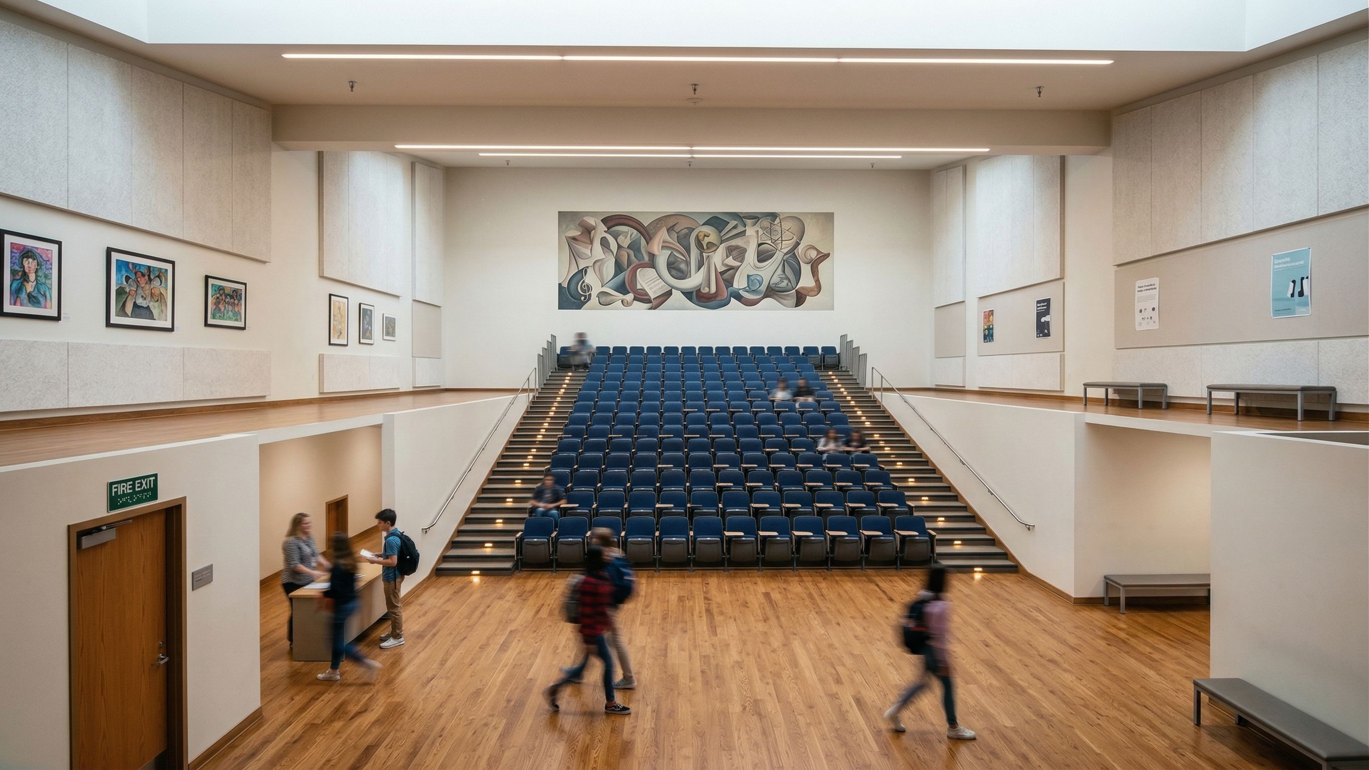 make this scene a theater with chairs that hold the audience in high school and do simple interior design and make the hall look super realistic