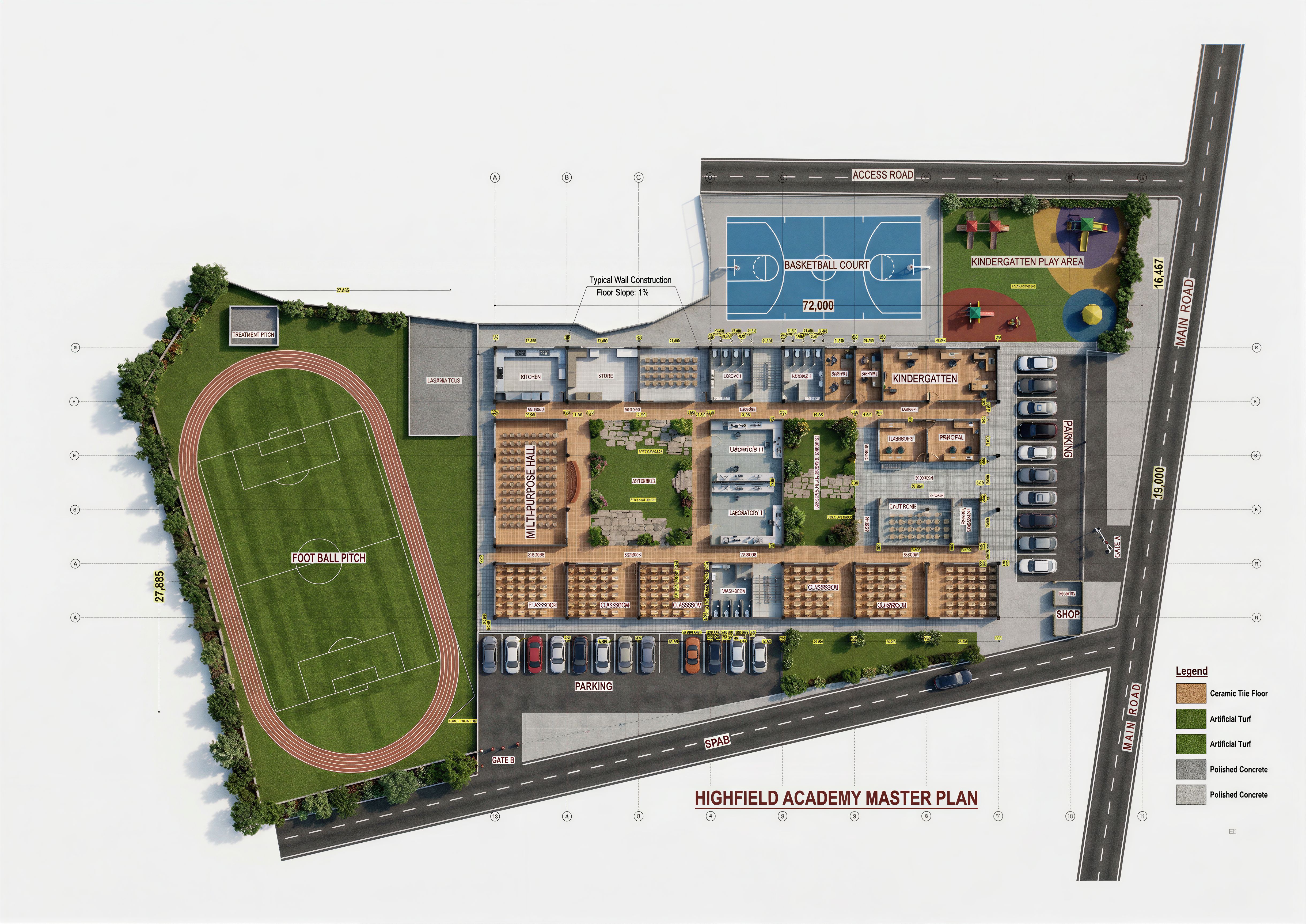 LAYOUT SHOWING A MASTER PLAN OF A SCHOOL WITH ITS CLASSROOMS, OFFICES, WAITING AREAS. GREEN SPACES IN THGE MIDDLE FOR ASSEMBLY AND SITTING. CLEARLY SHOW PARTITIONS AND WASH ROOMS. SHOW THE ROADS AND PARKING. USE CERAMIC FLOOR TILES ON THE FLOORS. MAKE LAYOUT REALISTIC AND HIGH RESOLUTION 8K., keep exact camera angle
