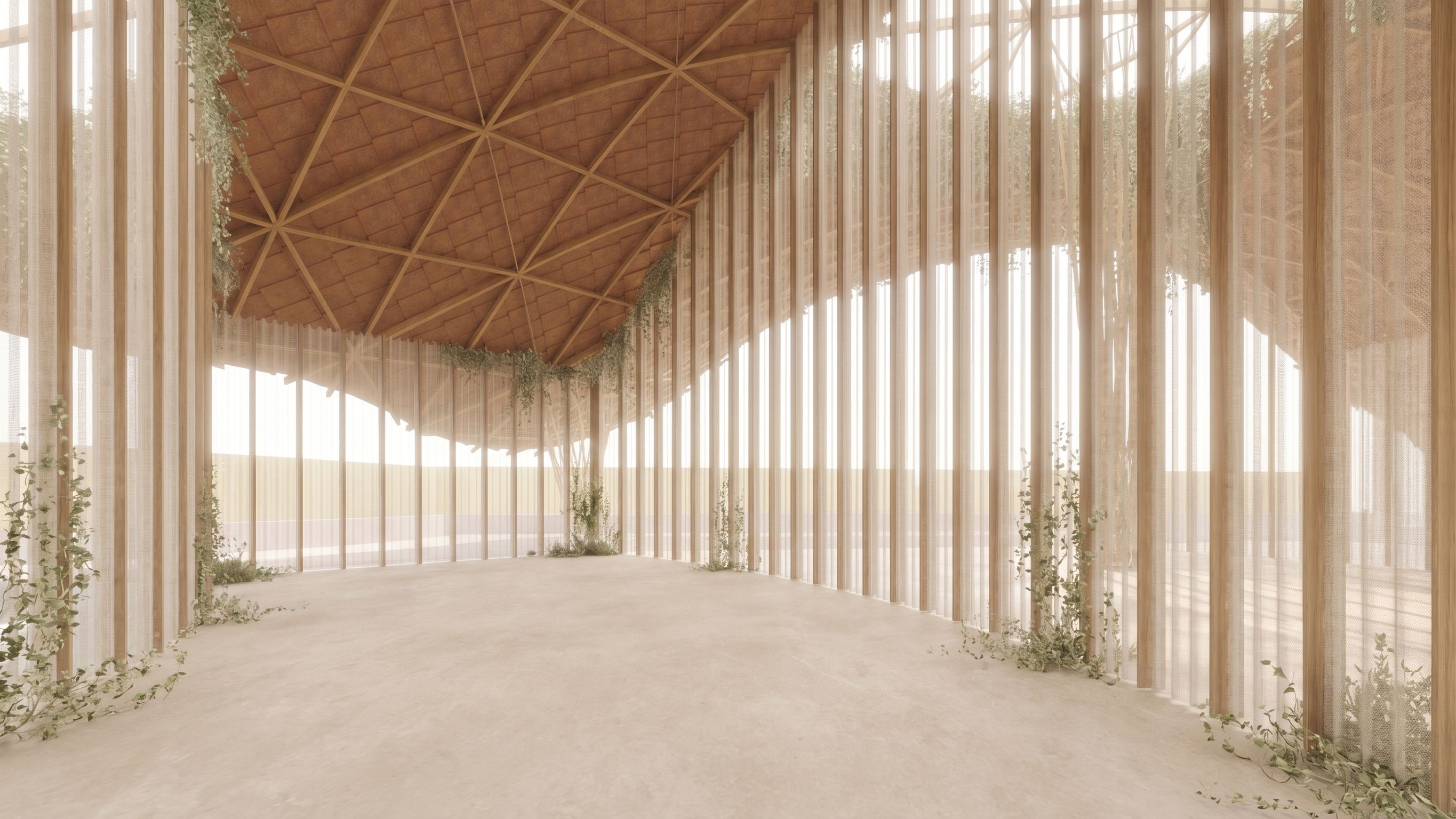 PromptTransform this raw Rhino interior into a soft, dreamy, blurred atmospheric architectural render while strictly preserving the exact geometry, composition, proportions, camera angle, roof form, column placement, curtain locations, atrium opening, and all architectural elements exactly as modeled. Do not redesign, simplify, add furniture, or alter the structure. This is a material, light, atmosphere, and subtle planting translation only. Create a quiet, hazy, poetic interior with the following qualities: very soft diffused daylight gentle bloom around bright areas slight cinematic blur / shallow haze low-contrast tonal range warm beige, oat, sand, linen, pale wood, muted honey, and soft olive tones subtle atmospheric depth minimal, calm, meditative feeling high-end architectural visualization dreamlike but still believable soft washed-out realism, not illustrative slightly gauzy lens softness delicate glow through fabric Material direction: keep all fabric curtains / veil layers as the dominant visual element fabric should read as sheer woven linen or translucent mesh, vertically hanging, light beige to warm taupe fabrics should catch light softly and appear slightly layered, airy, and semi-transparent maintain the rhythm and density of every curtain line from the model wood framing / posts should become warm natural timber, matte finish, light to medium honey-brown floor should read as soft limewash concrete or pale stone, matte and lightly reflective roof / ceiling should feel warm and subdued, with natural material richness but not sharp texture structural elements should remain elegant and understated, never shiny any metal should be muted and soft, not glossy overall palette should feel natural, tactile, calm, and slightly sun-faded Greenery direction: add light, selective greenery only where architecturally appropriate greenery should feel integrated into the building, not decorated after the fact use soft climbing vines, trailing plants, and delicate planted moments place greenery near openings, edges, courtyard conditions, perimeter thresholds, columns, or places where light and air naturally reach allow some plants to cascade gently from upper edges or soften corners keep plant density restrained and intentional plants should never block the architecture or overpower the fabric greenery should feel like a quiet extension of the atmosphere use muted natural greens, slightly dusty and sun-softened avoid tropical, glossy, highly saturated, or oversized plants avoid heavy planters unless they are subtle and built-in no random indoor jungle effect Lighting direction: use indirect morning or late afternoon daylight light should filter through the sheer fabric layers avoid harsh sun patches and avoid dramatic contrast exterior should be bright and slightly overexposed so the interior feels softly backlit introduce a subtle glow through openings shadows should be very soft and barely defined interior should feel luminous, dusty, and quiet Atmosphere / image quality: add a soft-focus photographic quality very slight blur as if shot through a delicate gauze filter subtle filmic grain muted highlights soft blooming edges calm editorial architectural mood preserve detail, but let it dissolve gently in the brightest zones no crisp hyperreal sharpness no heavy contrast no saturated colors no dramatic sunset tones Important preservation instructions: do not change the design do not move or delete curtains, walls, columns, roof members, stair openings, railings, or screens do not add new architectural elements do not reinterpret the architecture do not change the spacing or thickness of elements do not alter the camera framing keep the render faithful to the original model, only upgrading materials, light, softness, atmosphere, and restrained integrated greenery Target aesthetic keywords: soft architectural haze, sheer linen veil, blurred realism, meditative daylight, warm neutral palette, tactile natural materials, soft integrated greenery, quiet luxury, diffused glow, atmospheric interior, ethereal but grounded, understated editorial render Negative prompt: sharp hyperreal detail, glossy surfaces, high saturation, dramatic shadows, strong contrast, redesign, added furniture, people, decorative objects, random potted plants everywhere, tropical jungle, oversized leaves, bright green saturation, colorful flowers, futuristic materials, polished metal, plastic textures, over-stylized illustration, cartoon effect, excessive fog, symmetrical distortion, changed geometry, changed roof, changed curtain layout Final look: Make the image feel like a softly blurred architectural photograph where light, fabric, natural materiality, and restrained greenery are more important than sharp detail. You can also use this extra greenery line at the very end if the software responds well to prompt stacking: Extra line: Introduce sparse, elegant greenery similar to soft courtyard vines and lightly cascading plants, placed only where daylight, thresholds, and structure naturally support them., keep exact camera angle