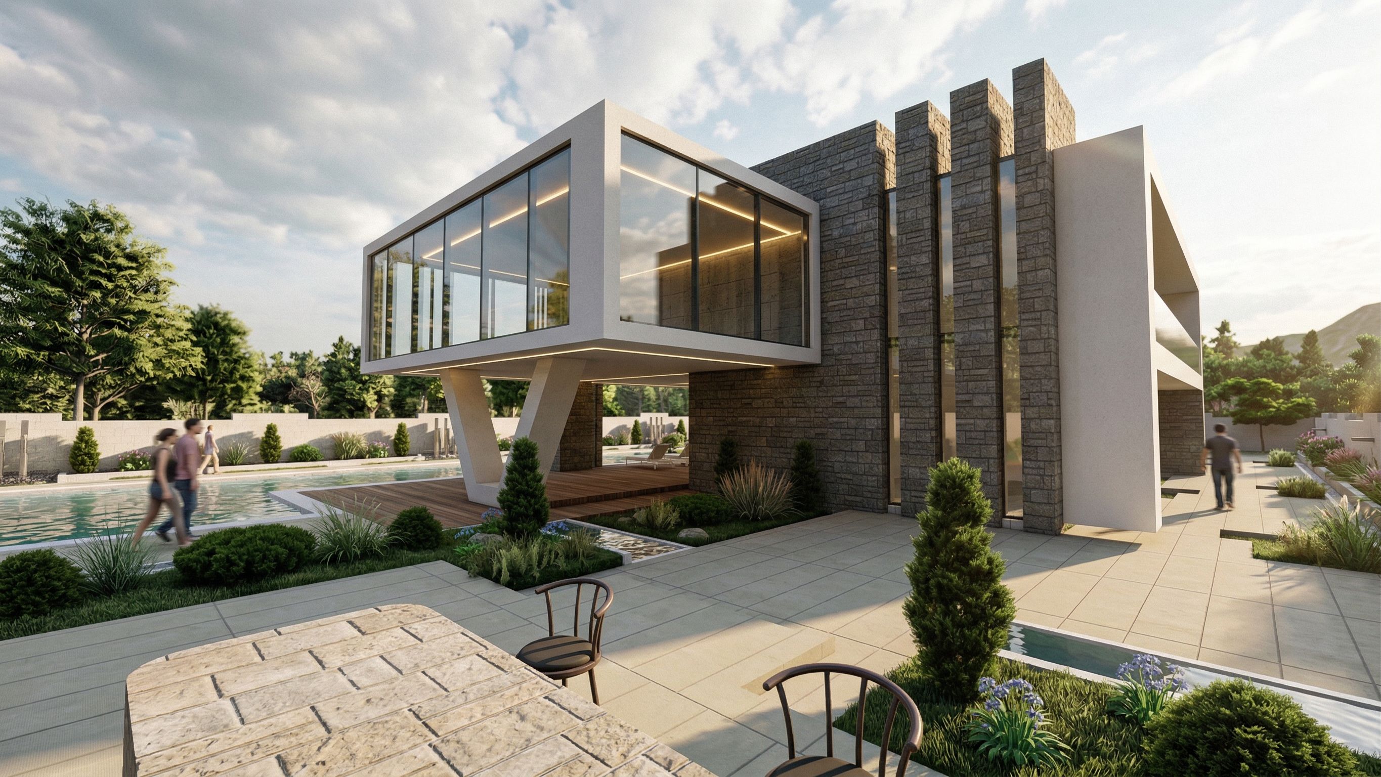 Prompt1. Materials: • Glass: Use glass material with appropriate Transparency settings, ensuring clarity and reflections in the surrounding light. • Wood: Apply realistic wood textures, such as natural wood with subtle grain patterns, especially for decking and flooring near the pool area. • Stone: Use a natural stone texture (e.g., granite or limestone) for the walls and some external decor, with visible stone grains and a smooth finish. 2. Lighting: • Natural Lighting: Simulate afternoon sunlight to create soft shadows and vibrant lighting, especially highlighting the large glass walls and outdoor spaces. • Artificial Lighting: Use warm LED lights inside for a cozy, welcoming feel. Focus on subtle interior lighting to match the realism of the modern design. • Ambient Lighting: Add soft ambient lighting around the pool area, creating gentle reflections in the water for added realism. 3. External Details: • Swimming Pool: Apply a reflective water material for the pool, with small waves to simulate water movement and add reflections from the surrounding area. • Plants: Add detailed vegetation like trees and shrubs, with realistic shading and highlights based on natural sunlight., keep exact camera angle