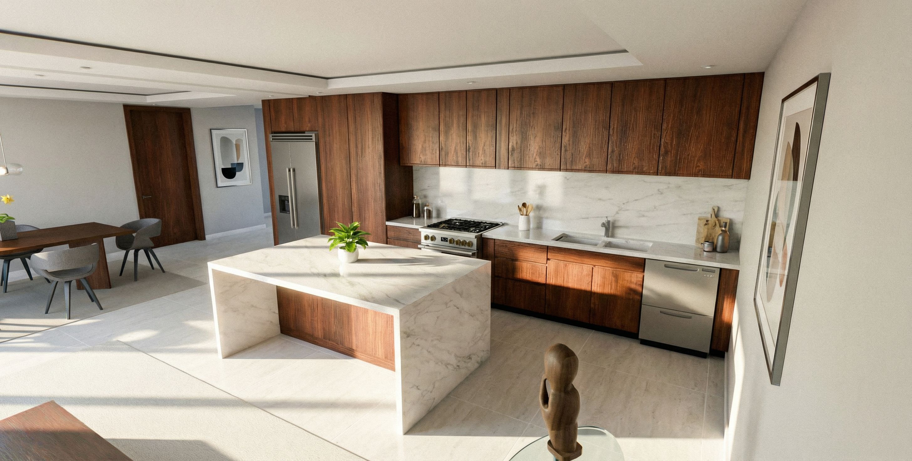 PromptPhoto of a contemporary kitchen design featuring sleek cabinetry and a central island. Emphasize the rich wood mahogany textures of the cabinet doors contrasted with a polished marble countertop. The stainless steel refrigerator and modern appliances add a touch of sophistication. Set in a bright, airy space with natural light streaming in, casting soft shadows on the tiled floor. Capture the scene from a slightly elevated angle to highlight the open layout, using a wide-angle lens for a spacious feel. Include decorative elements like a small plant and contemporary art to enhance the livability., keep exact camera angle
