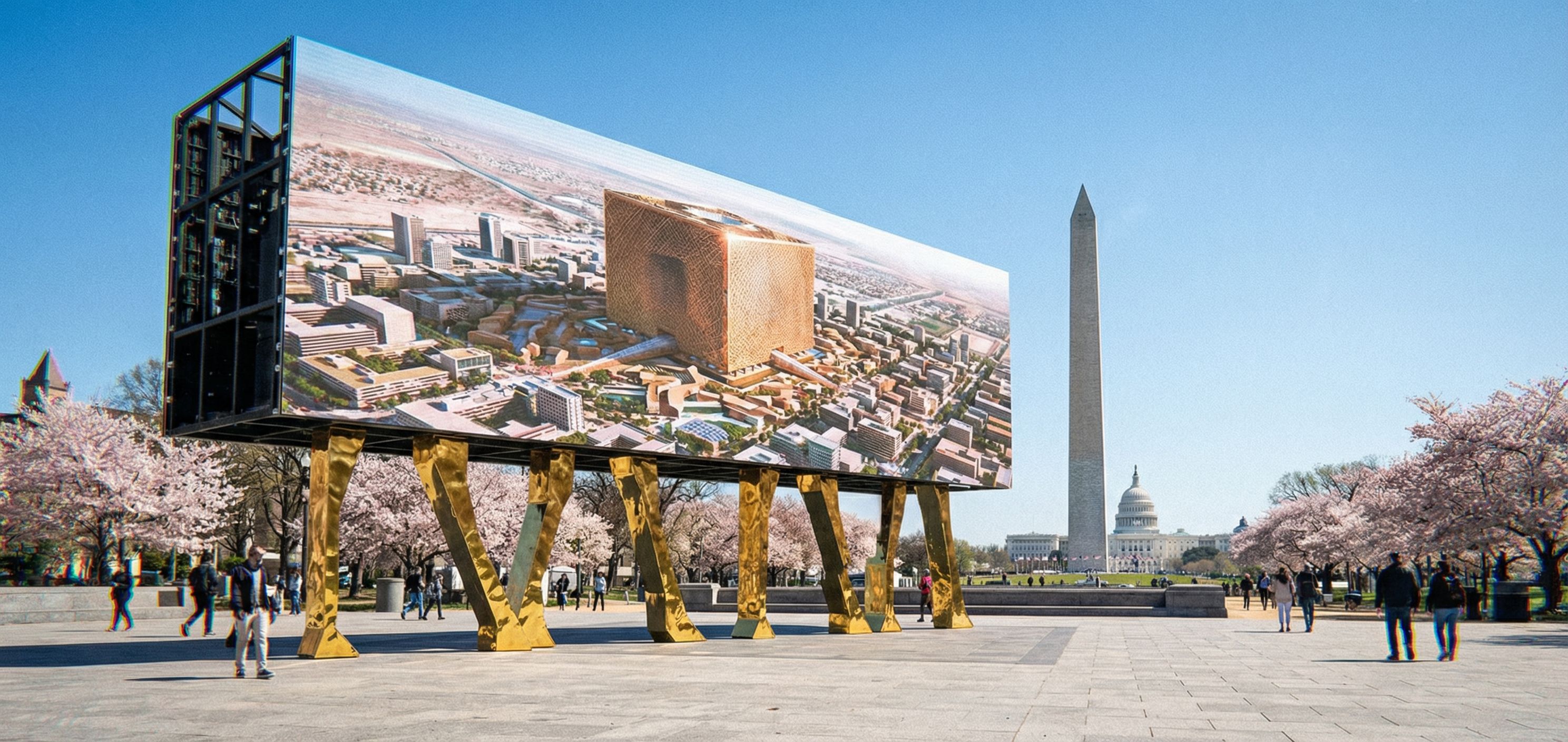 Promptkeep exact camera angle , BLACK IS SCREEN , YELLOW IS GOLD CLADDING , , Washington DC , PUT New Murabba PROJECT ON SCREEN,, keep exact camera angle