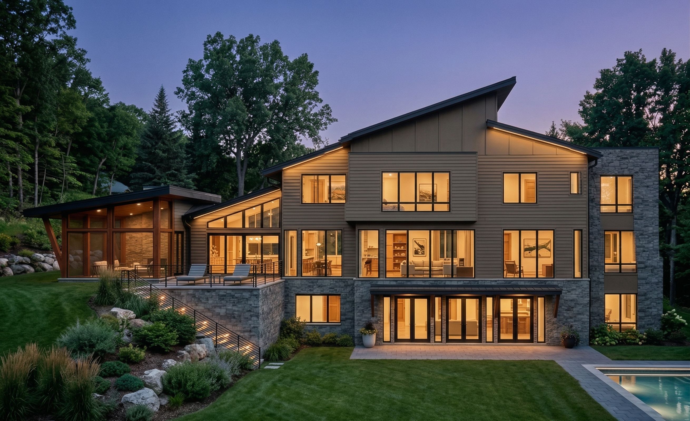 Promptchange the siding color to dark beige with black trim and black windows, keep exact camera angle