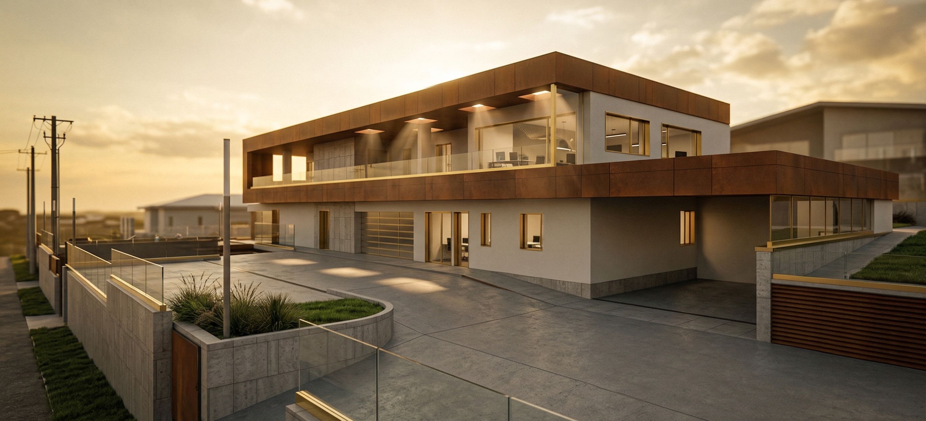 PromptCreate a highly photorealistic, high-resolution image. Use the materials shown in the image. There are Corten-effect Alucobond panels; light-colored plaster; glass parapets with a brass-colored aluminum profile underneath; the thin window and French window frames are brass; the volume in the center of the building, visible on the ground and first floors, is clad in concrete-effect tiles. The exterior flooring is industrial concrete; the exterior walls are clad in the same concrete-effect tiles as the building; the horizontally slatted doors seen at the bottom right are made of Corten panels, identical to the Corten cladding of the building; on the first-floor balcony ceiling, there are dark, square-shaped areas, which are square holes that allow light to penetrate from the sky to the first-floor balcony; it shows volumetric rays of light passing through these square holes. The transparent light blue parts are made of clear glass., keep exact camera angle