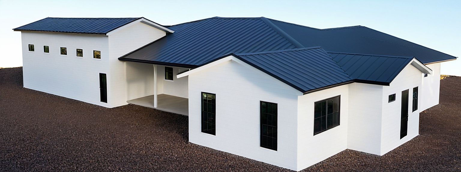 16 foot tall RV garage with white stucco exterior, standing seam black metal roof, black garage door, surface of back patio is cobblestone brown pavers, trim windows with 3 inch black wood trim