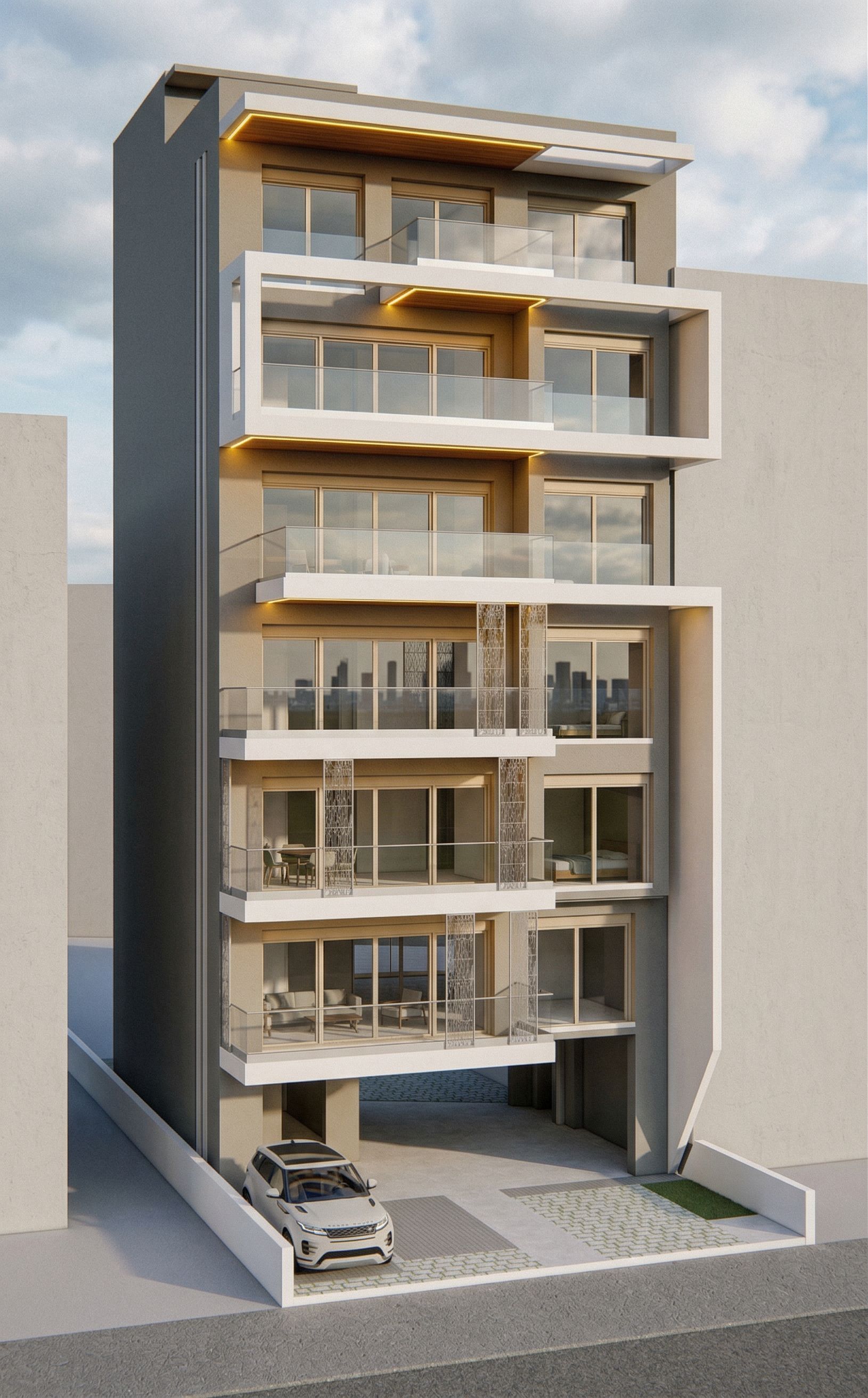 Photo of a modern apartment building featuring sleek lines and contemporary balconies. Emphasize , expansive glass windows, and wooden tops of balcony accents. Capture natural sunlight enhancing the architectural details, with soft shadows cast by the balconies. Basic color ral 7006 and some beige details with white balconies. Dont change the building. No trees .Do light grey the right and left box. Grammical yellow Light in the wooden balcony, keep exact camera angle, keep exact camera angle