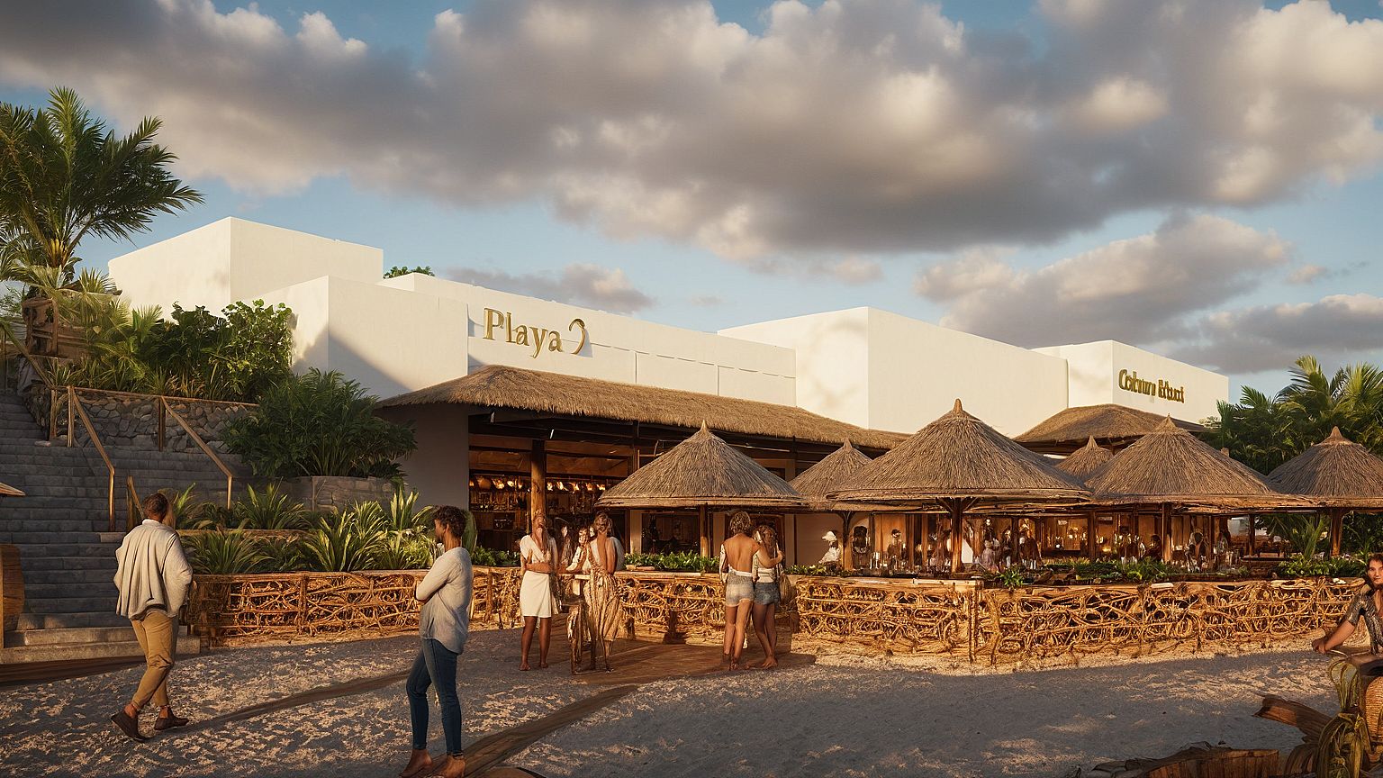 PromptUltra-photorealistic render of a tropical beach-themed bar at golden hour. Rustic palapas with natural thatched roofs, wooden furniture, and warm golden sunlight casting soft, long shadows. Groups of people appear natural and diverse in age, clothing, and expressions—smiling, laughing, holding cocktails, and socializing in a lively, authentic way. Casual summer outfits, sun-kissed skin tones, and relaxed body language enhance the realism. Golden sky reflections shimmer on glassware and bottles, with tropical details like tiki torches, surfboards, and lush greenery. Shot as if captured with a Canon EOS R5, 50mm f/1.8 lens, cinematic depth of field, soft bokeh, volumetric lighting, ultra-detailed textures, 8K ultra-realism, cinematic composition.