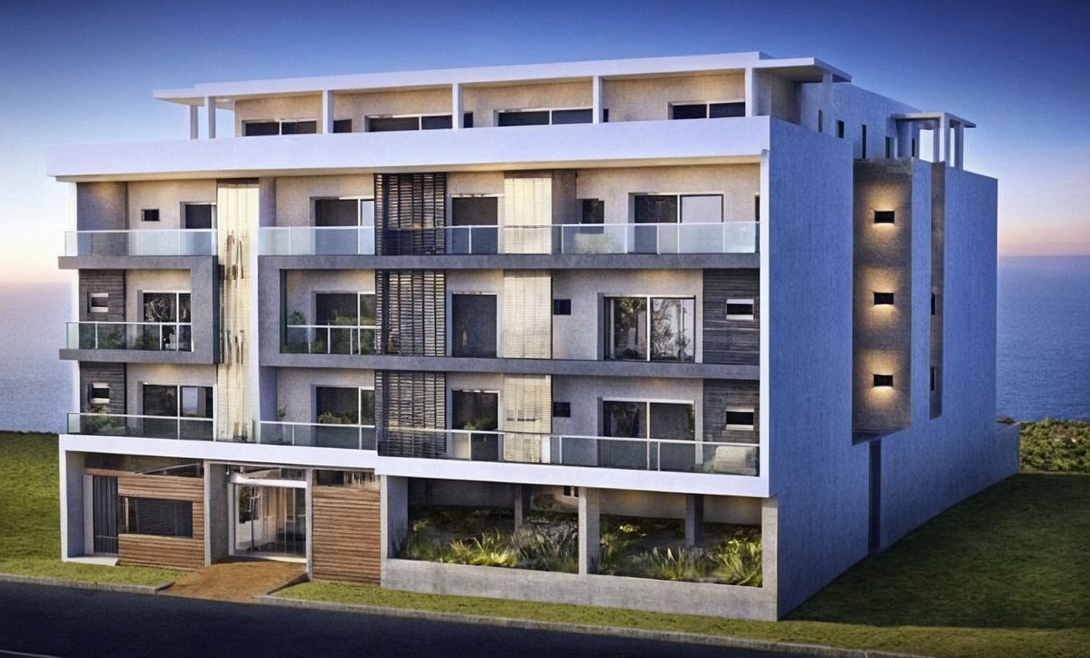 PromptModern apartment building, balconies with glass railings, large symmetrical window arrangement, garden rooftop structure, ground floor entrance with carpark, concrete facade with grid pattern and wood accent