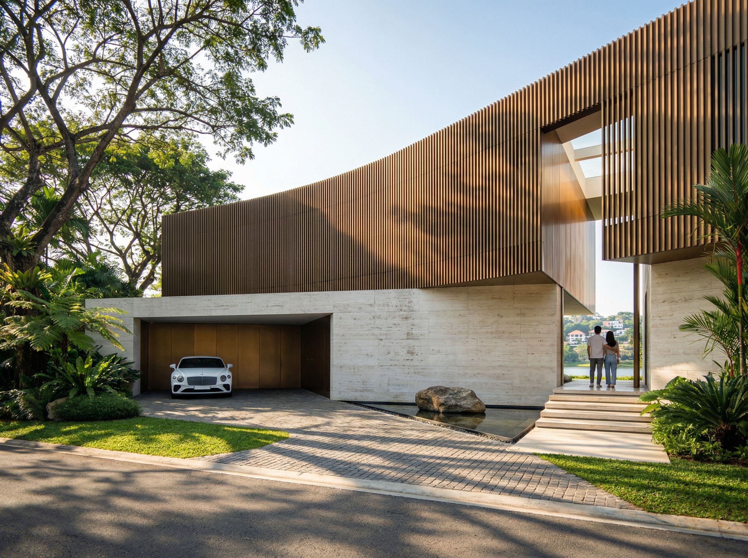 A photorealistic architectural rendering of a massive, ultra-minimal luxury curved residence based strictly on a reference SketchUp image for design, camera angle and image proportion. The facade features a sophisticated blend of White Travertine stone slabs on the ground floor, while the upper level is wrapped in continuous, sweeping vertical Bronze aluminum slats following a graceful curve. A two-bay garage is situated on the bottom left, featuring a white Bentley parked in the leftmost bay facing out, with the interior garage wall clad in sleek Bronze panels. To the far right, a grand entrance with a 4-step staircase leads upward. At the top of the stairs, a stylish Korean celebrity-like couple in casual attire stands with their backs to the camera, gazing through a tall, narrow architectural void toward a distant lake and a hillside village. Warm golden evening light spills from a skylight, grazing the interior bronze walls. The environment is lush with tropical greenery and large architectural trees. The driveway is paved with long, narrow rectangular cobblestones in a running bond pattern. Narrow reflecting pond with boulder. The scene is captured during the morning with soft light and clear blue sky. In the foreground, sunlight filters through the intricate branches of large trees, casting dappled shadows across the grass, the road, and the house. High-end cinematic lighting, serene and luxurious atmosphere.