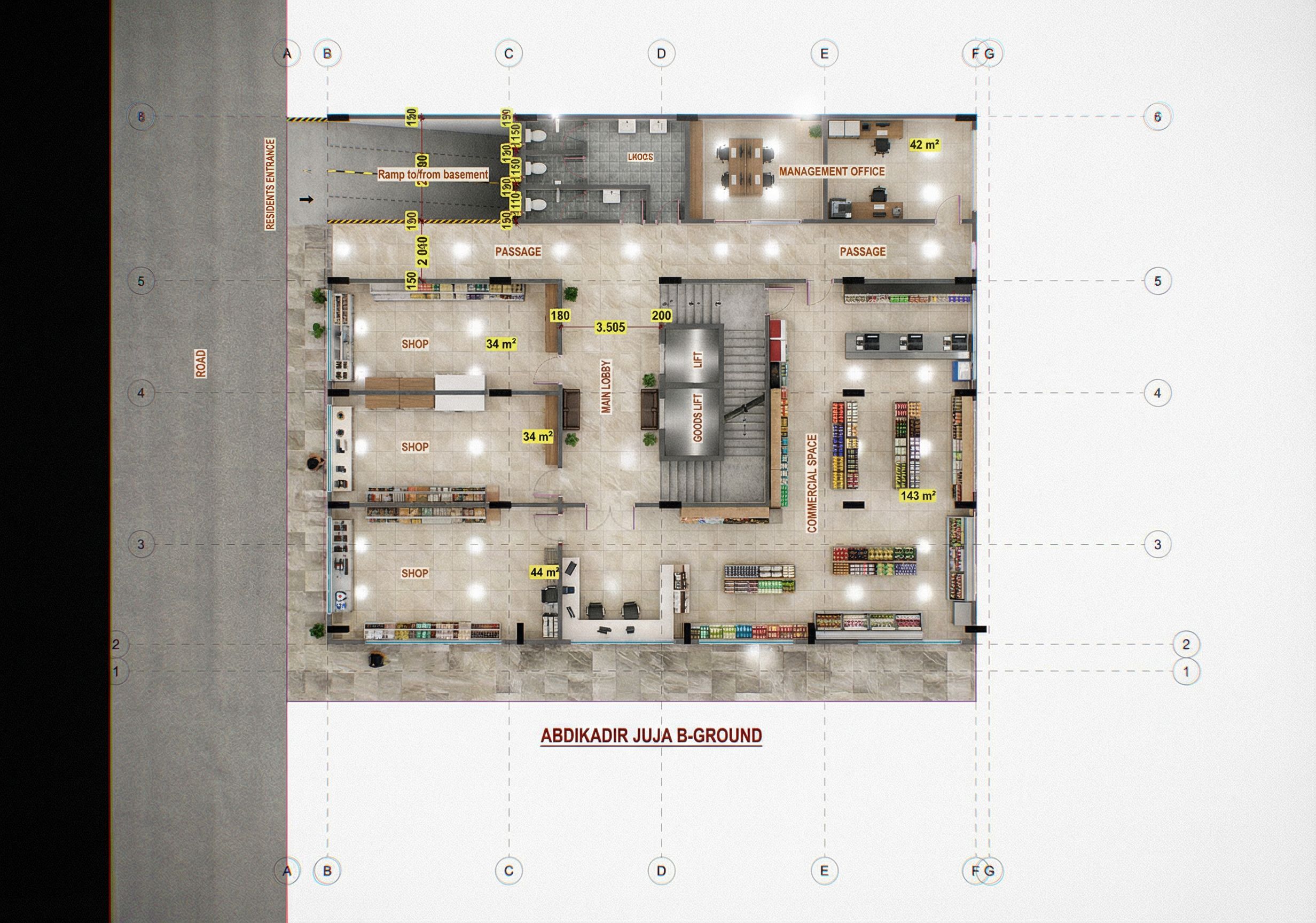 Promptlayout showing GROUND FLOOR OF A BUILDING with partitions and internal measurements clearly defined. use ceramic tiles on the floor finishes. MAKE LAYOUT IMAGE HIGH RESOLUTION AND REALISTIC. IMAGE SHOULD BE REALISTIC AND TWO DIMENSIONAL AND CLEARLY DEFINE THE WASH ROOMS. INCLUDE SHOPS AT THE FRONT WITH A LIFT LOBBY AT THE BACK, WASHROOMS AND THE COMMERCIAL AREA AS A SUPERMARKET. INDICATE THE VEHICULAR RAMP TO THE BASEMENT. MAKE LAYOUT REALISTIC., keep exact camera angle