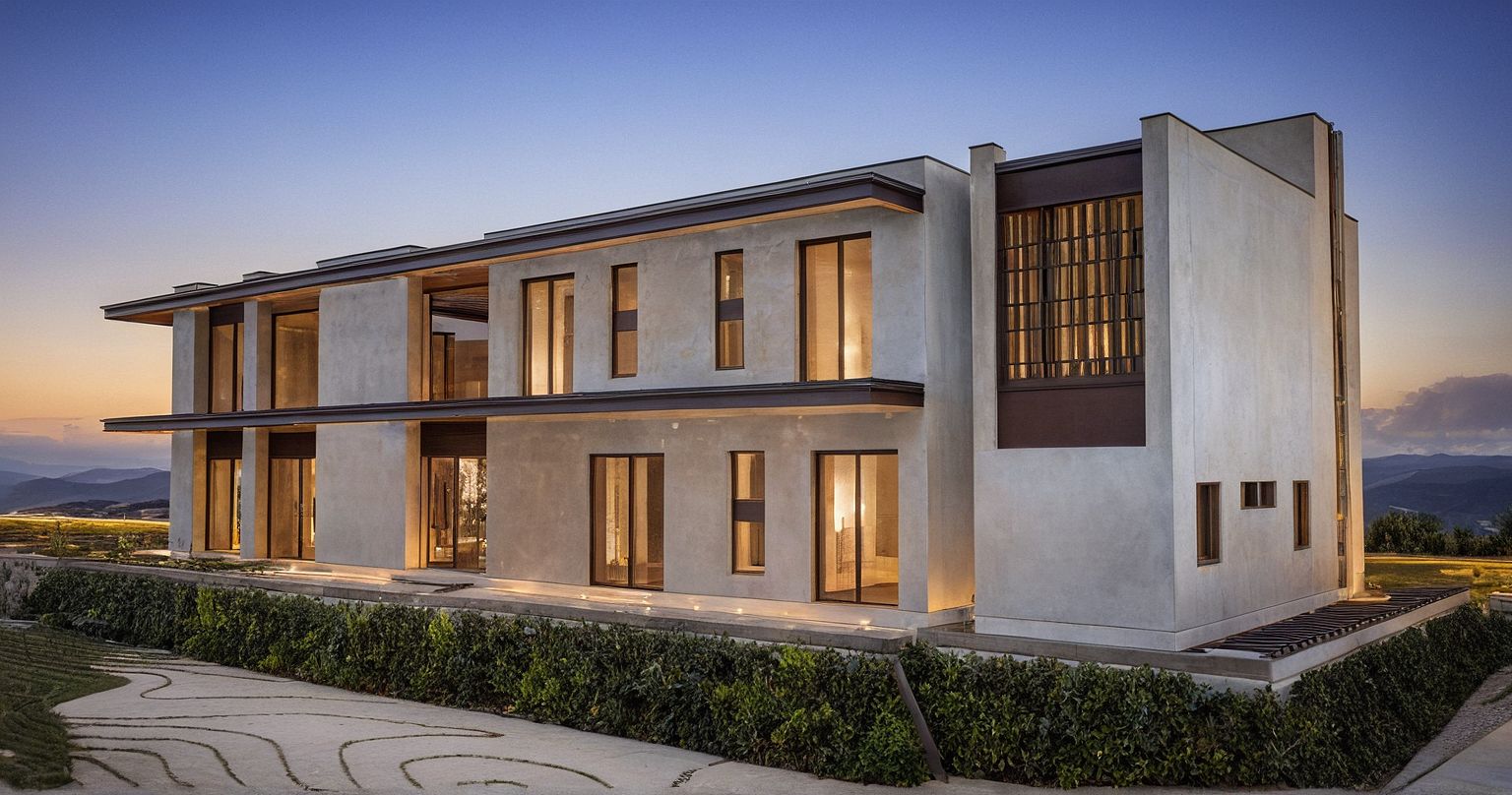 PromptModern high-end architecture photo, limestone wall finishes, wooden lattice, horizontal black steel elements, warm lighting, Tintex glass, abundant landscaping and green slopes, no background.