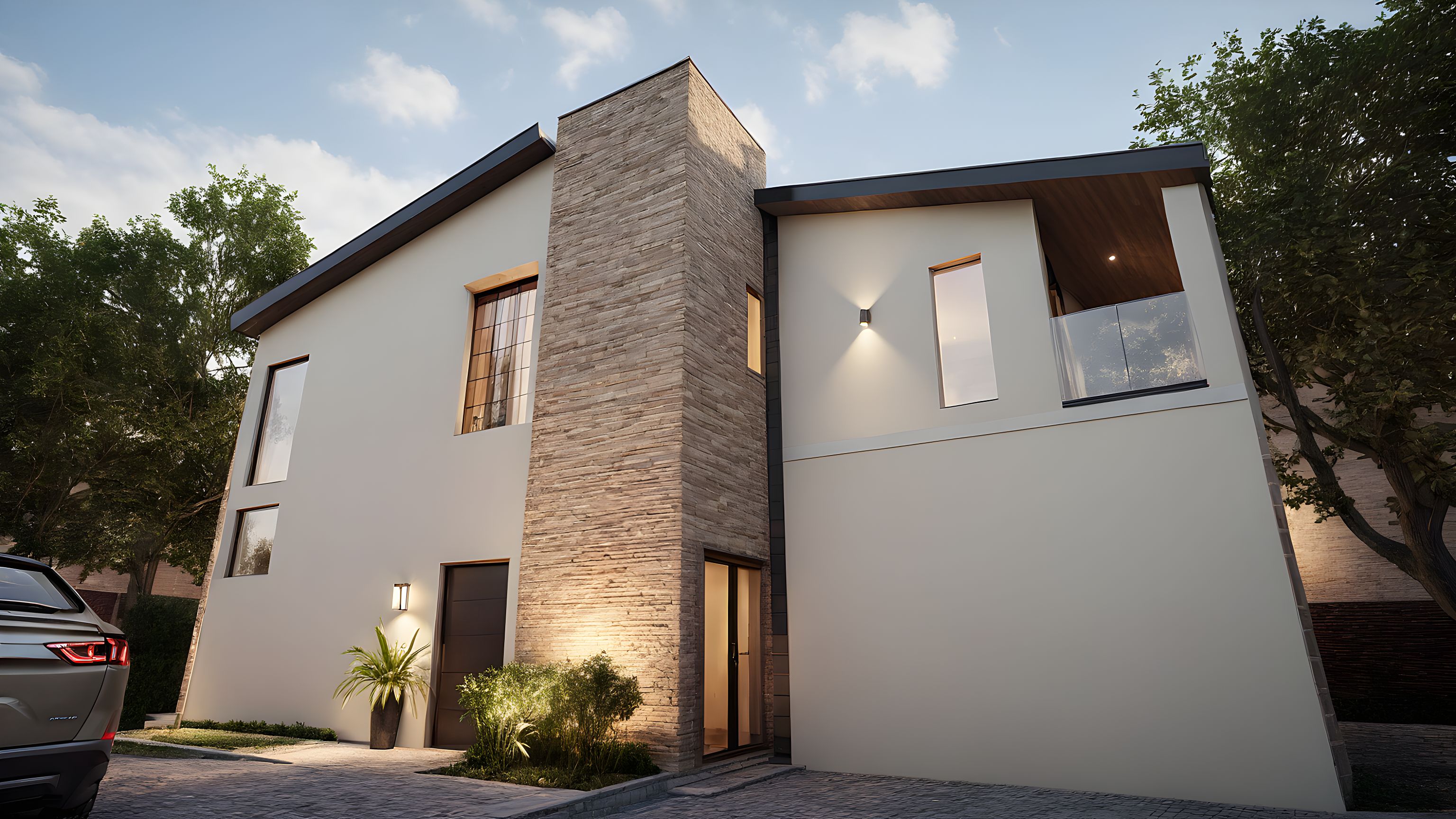 house with smooth masonry walls in light beige color. the exposed brick wall is in natural color. the house is modern with a rustic touch. it has a large parking area for two vehicles at the entrance.