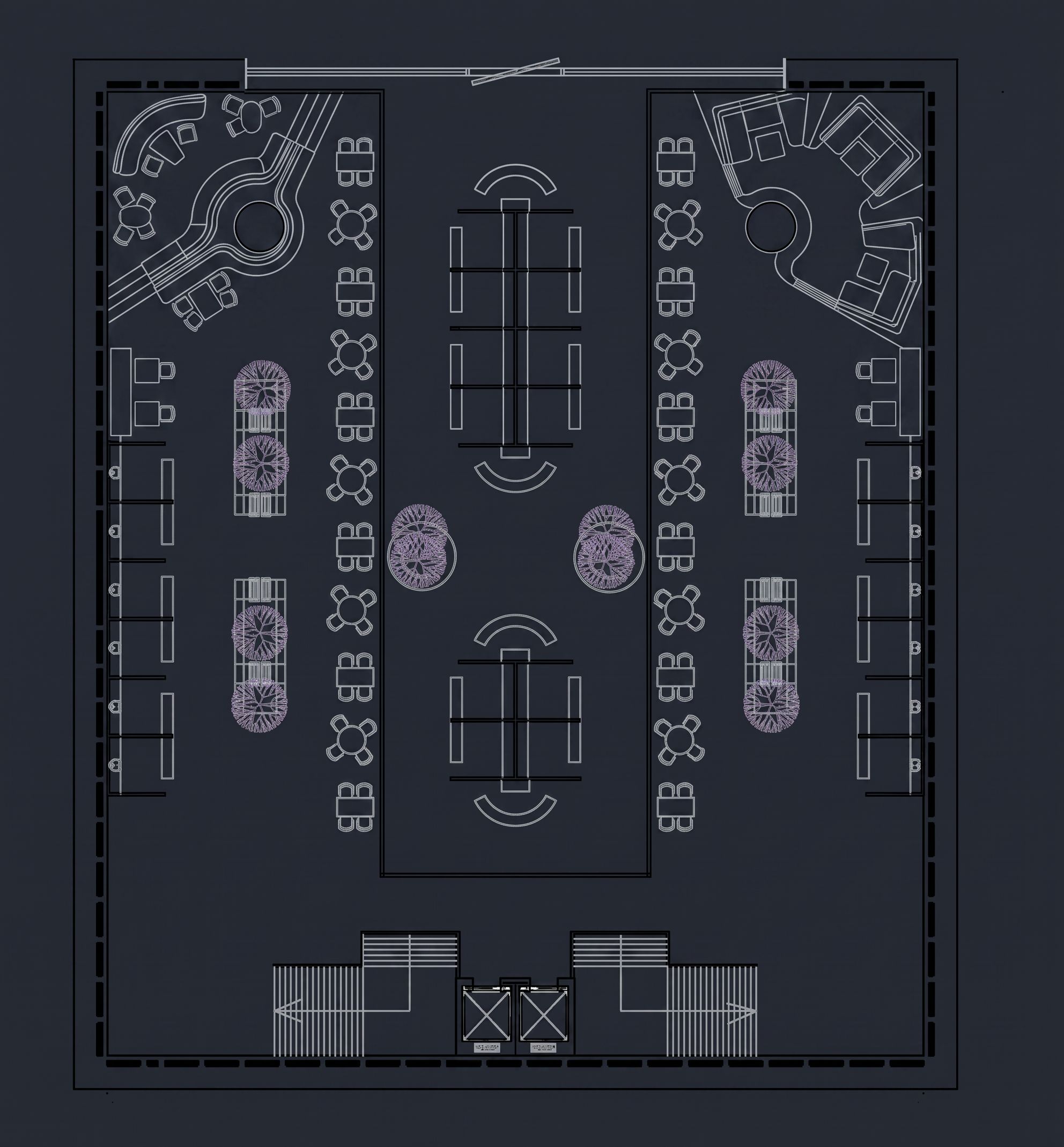 PromptEdit the provided floor plan. Keep the entire layout unchanged except for the two upper corner areas along the glazed façade (top left and top right corners). Redesign only these corner zones into seating areas that are clearly oriented TOWARD the exterior view (toward the top edge of the plan / toward the façade). All seating must face outward, toward the glass façade and the view outside. Do NOT orient seating inward into the space. Avoid any arrangements that face the interior. The main direction of seating must be outward. Use built-in benches, lounge seating, or café seating arranged in a way that naturally directs people’s view toward the façade. The geometry of the seating should support this orientation (curved or angled if needed), reinforcing the outward-facing direction. Maintain clear circulation paths and do not change any other parts of the layout. The intervention should feel architectural, clean, and intentional, with precise alignment and consistent linework. Style: clean architectural floor plan, professional, minimal, precise., keep exact camera angle